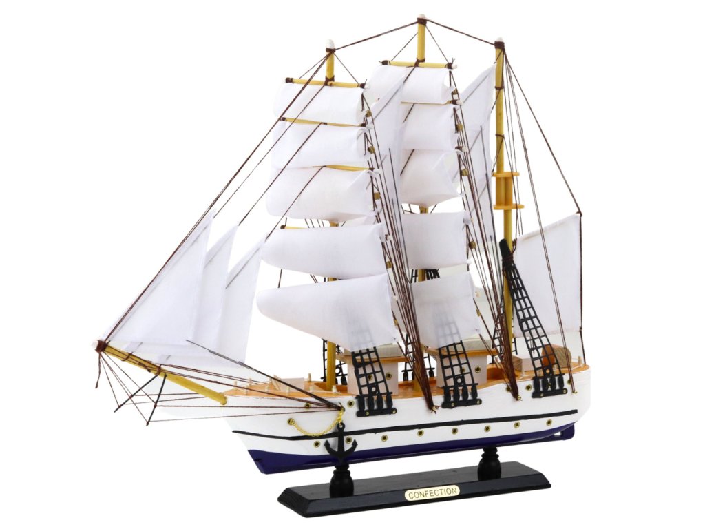 Model je vytvořen s pečlivou pozorností k detailu – od dřevěné paluby a lakovaných stran až po ručně napnutá lana a rozvinuté látkové plachty. Loď sedí na pevné černé základně nesoucí název „Confection“, což zdůrazňuje její charakter. Vypadá perfektně jako dekorace v obývacím pokoji, pracovně, knihovně nebo kanceláři – dodává interiéru v námořním stylu charakter, prestiž a eleganci.