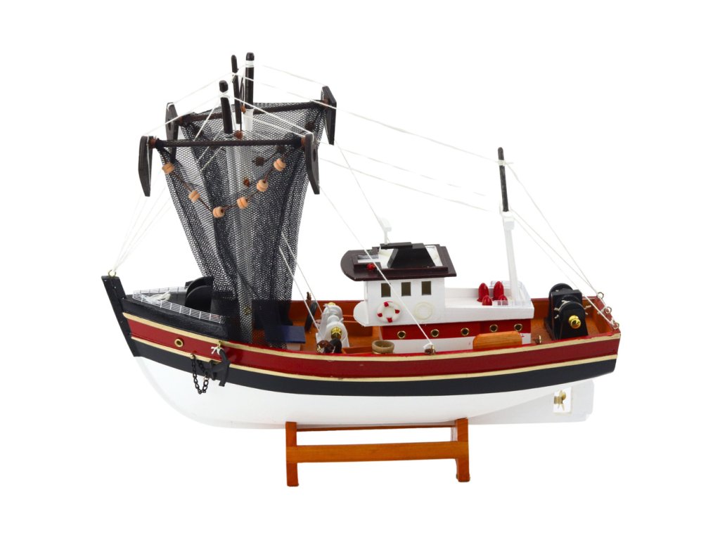 Tento model rybářské lodi s rybářskou sítí je jedinečnou nabídkou pro milovníky námořní a námořní estetiky. Klasický design lodi byl vylepšen o realistické detaily na palubě: rybářskou síť zavěšenou na jeřábech, záchranný kruh, vesla, kotvy a kotvící mechanismy. To vše věrně zachycuje charakter autentických plavidel používaných při pobřežním rybolovu.