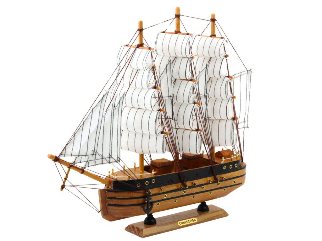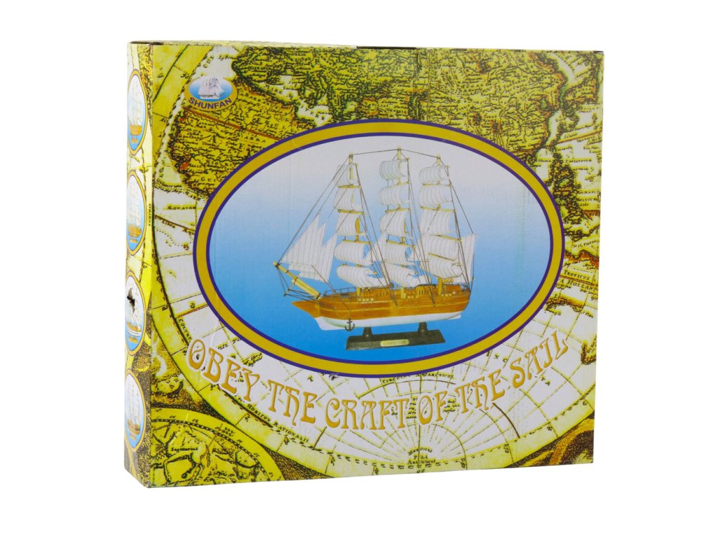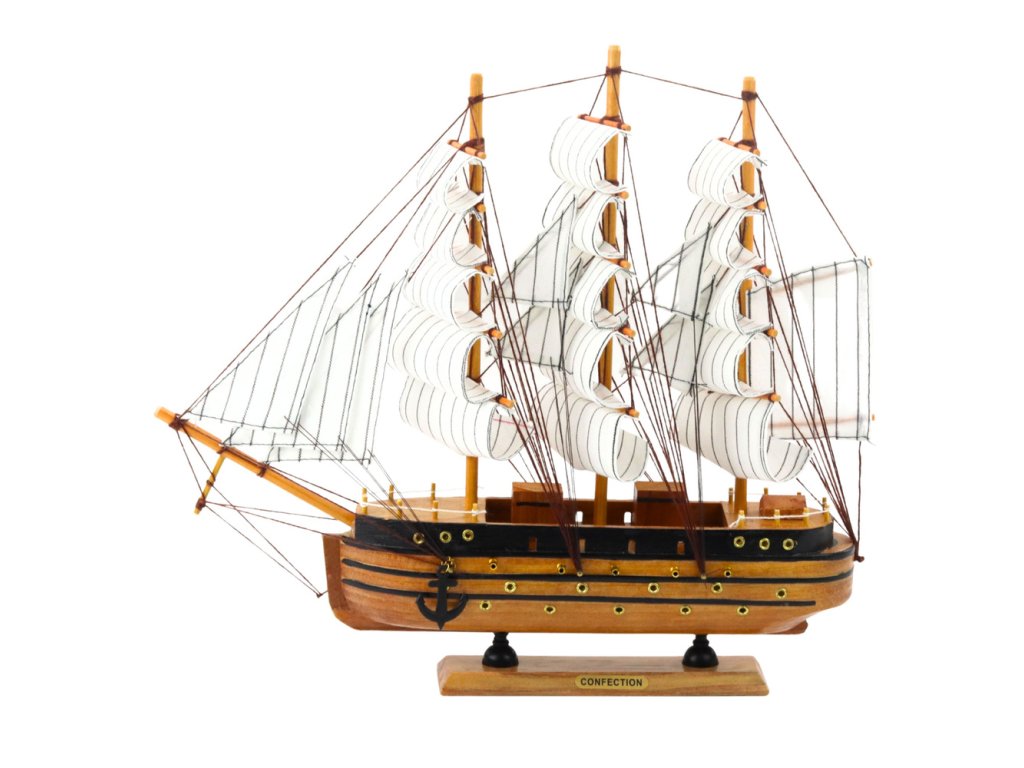 Trup lodi je vyroben z teplého dřeva s černými a zlatými akcenty pro detail. Bílé textilní plachty a pečlivá lanoví doplňují realistickou siluetu plavidla. Celý kus je upevněn na dřevěném stojanu s plaketou. Díky kompaktní velikosti je ideální pro vystavení na komodě, polici, stole nebo vitríně.