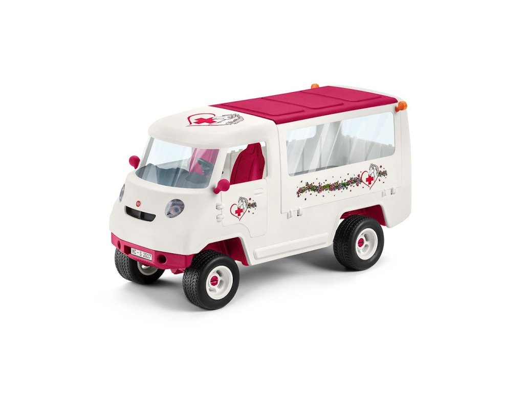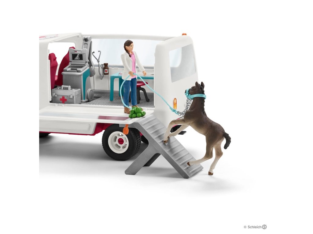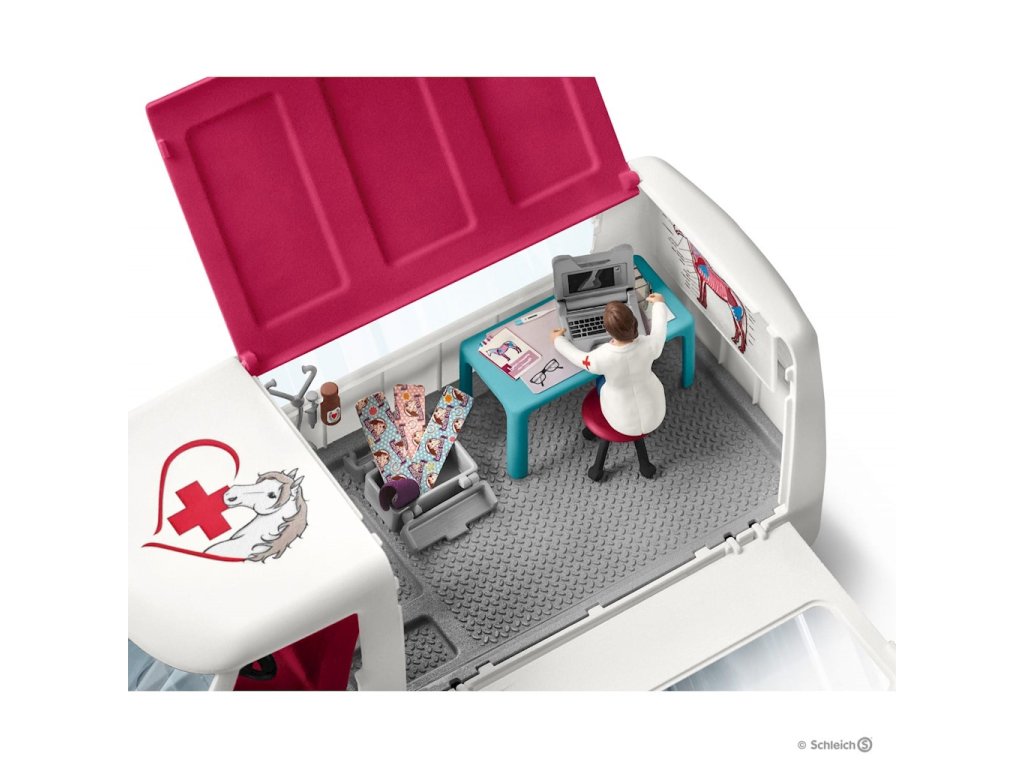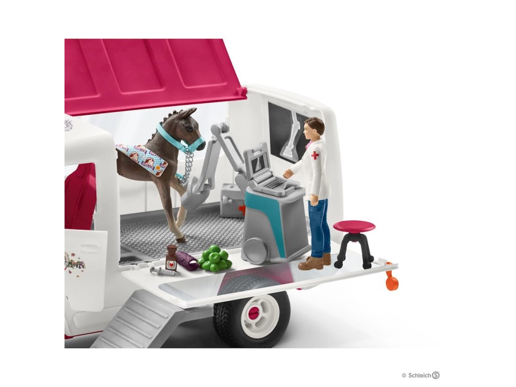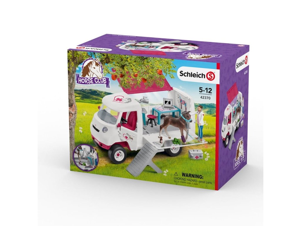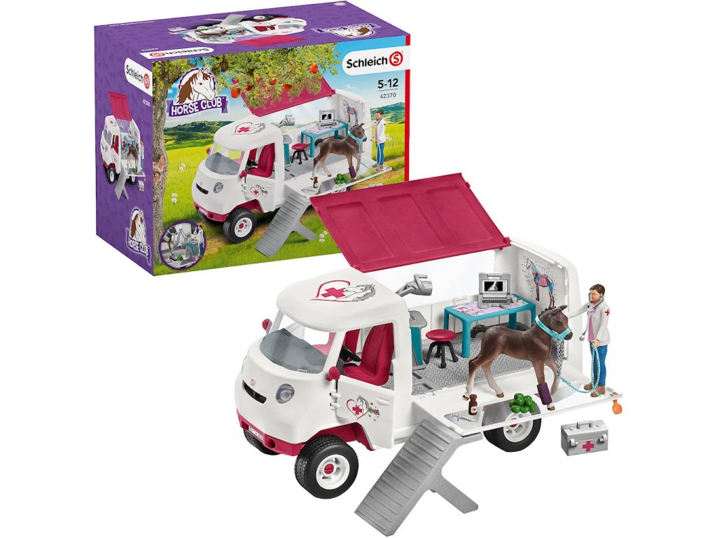 Zvířecí klinika Schleich s hříbětem 42370S precizně zpracovanou sadou pro zvířata s hříbětem se děti mohou starat o své pacienty s péčí. Mobilní klinika v setu obsahuje hannoverské hříbě, které starostlivá veterinářka vyšetří ve své ordinaci. Vůz lze otevřít z boku pro přístup do interiéru vybaveného nezbytným lékařským vybavením pro ošetření koní. Hříbě lze po schodech uvést na speciální plošinu, která vznikne otevřením boku kliniky.