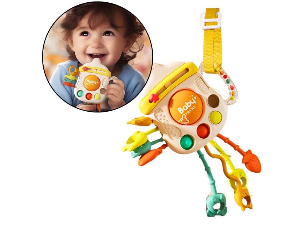 - Funkce: senzorické provázky, vyskakovací knoflíky, kousátka, rukojeť, klip na zavěšení