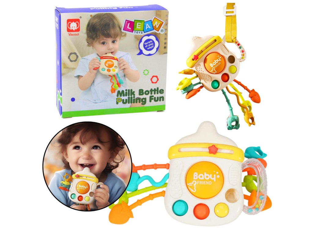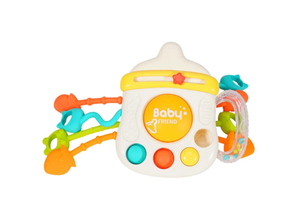 Vzdělávací hračka pro nejmenší v podobě barevné lahvičky na mléko je ideální nápovědou podporující smyslový a manuální vývoj dítěte od prvních měsíců života. Interaktivní hračka vytvořená s ohledem na potřeby kojenců – pomáhá rozvíjet úchop, koordinaci ruka-oko, stimuluje hmat, sluch a zrak.