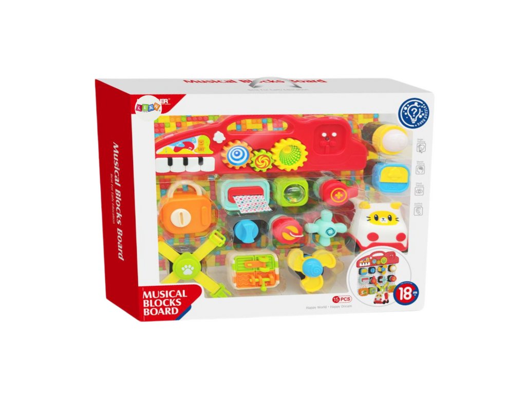 Horní část panelu je vybavena praktickým transportním madlem, které usnadňuje přenášení hračky. Součástí jsou také 4 klávesy klavíru, které vydávají veselé zvuky a melodie, stimulují sluch a podporují interakci.