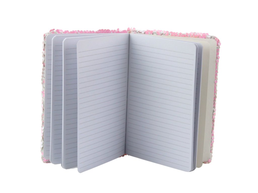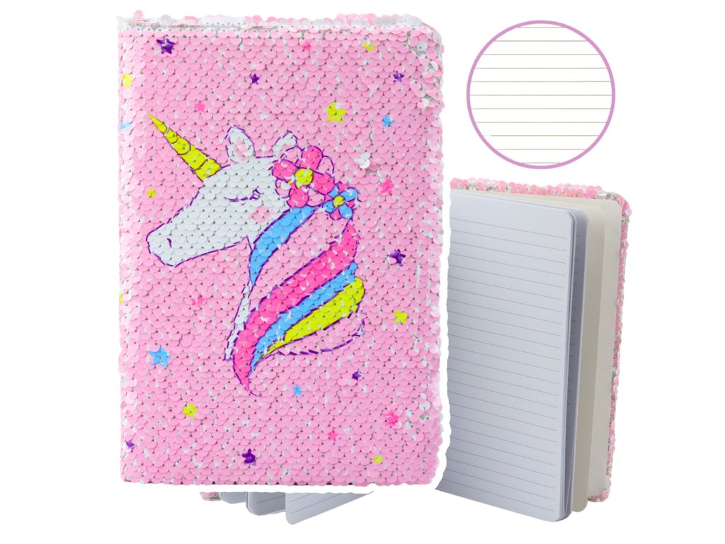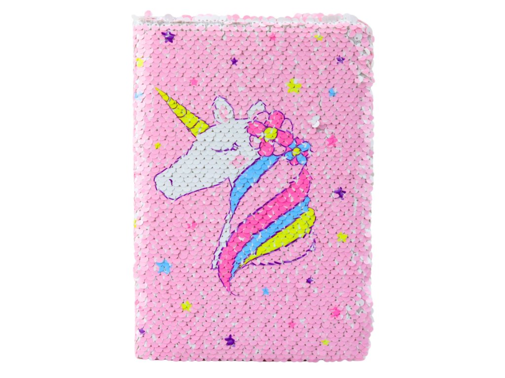 Tento jedinečný notebook kombinuje funkčnost s kouzelným designem, který zaujme na první pohled. Obal je pokryt vrstvou pohyblivých, třpytivých růžových flitrů, které skrývají barevný obrázek jednorožce s květinovým zdobením. Když přejedete rukou po povrchu, flitry změní barvu na bílou a vytvoří efekt měnícího se pozadí – perfektní aktivita pro děti a mladé dospělé.