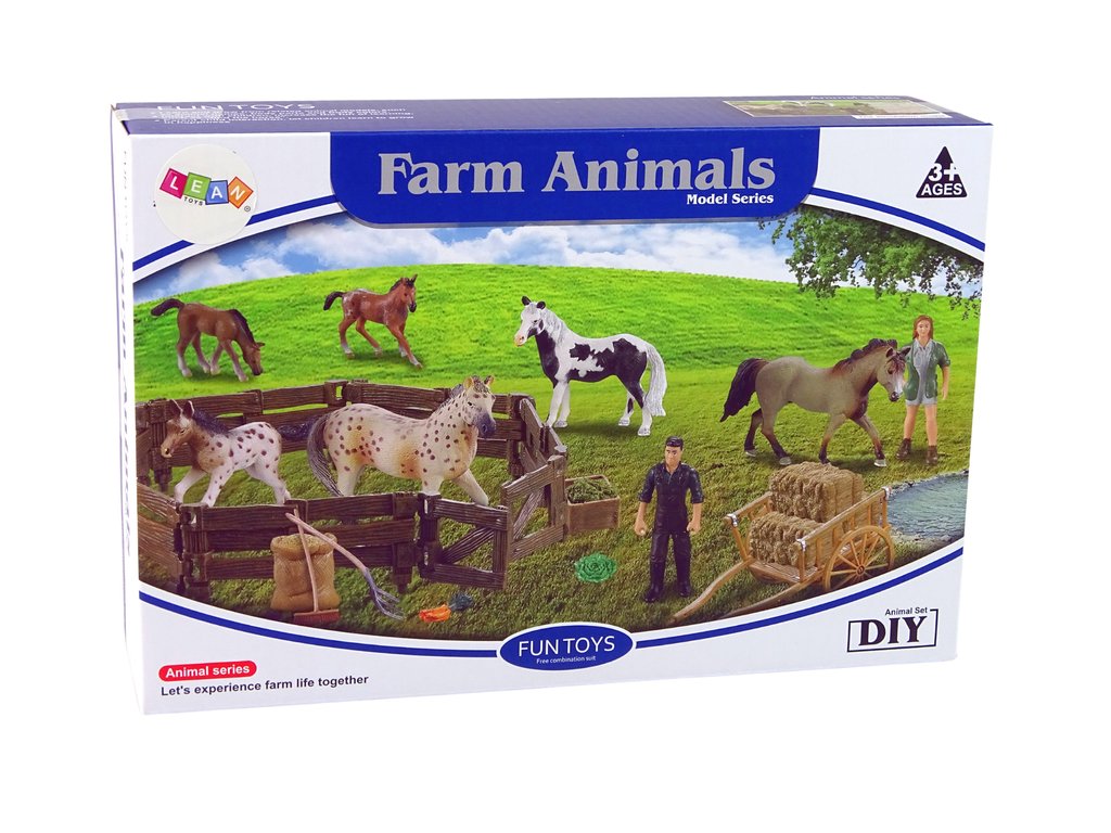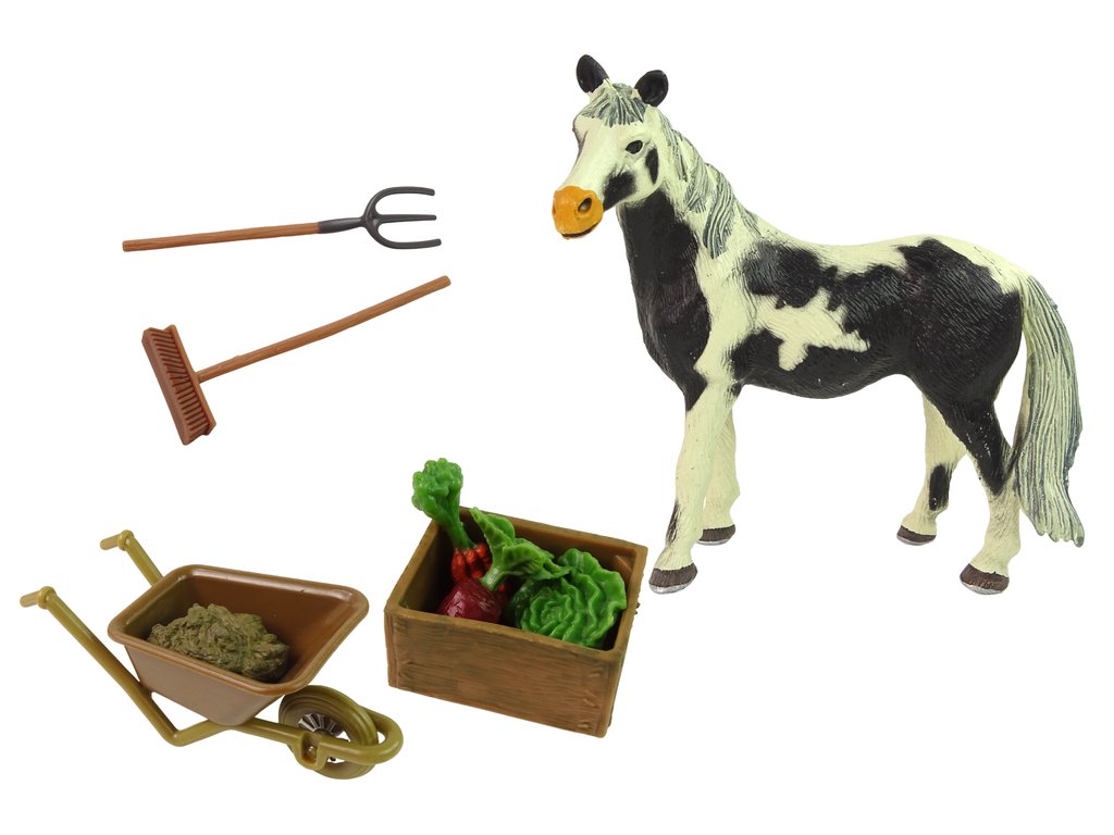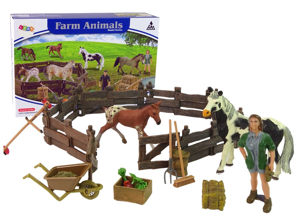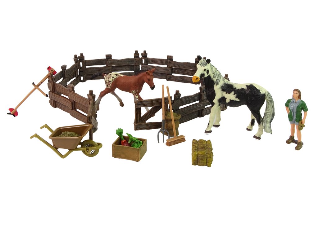 Trakař vám umožní převážet nářadí a potřebné věci na farmě z místa na místo. Na pořádek v usedlosti se budou hodit nástroje jako smeták nebo vidle. Dřevěná ohrada pojme velkého tobiánského koně s černým hříbětem a umožní jim řádnou péči se speciálními napáječkami a krmivem - mrkev a seno - součástí sady. Uvnitř mohou ošetřovatelé trénovat své koně.