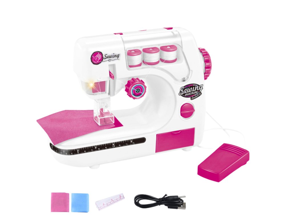 Tento stroj skutečně šije – látku lze šít pomocí speciálního knoflíku nebo nožního pedálu. Je vybavena praktickými funkcemi, jako je zvedák přítlačné patky, zvedák jehly a světlo, které osvětluje látku během šití. Vydává také realistické zvuky šití, díky čemuž je zážitek ještě autentičtější. Jehla je chráněna plastovým krytem, který chrání děti před zraněním.
