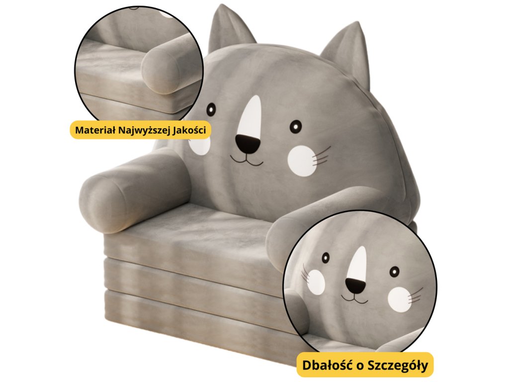 Křeslo je vyrobeno z výjimečně měkkého a na dotek příjemného plyše, který zajišťuje pohodlí při používání a dodává interiéru útulnost. Decentní barvy, oblé tvary, okouzlující uši a vyšívaný kočičí obličej dělají z tohoto kusu nábytku radost svým vzhledem a dokonale zapadnou do dětského pokoje.