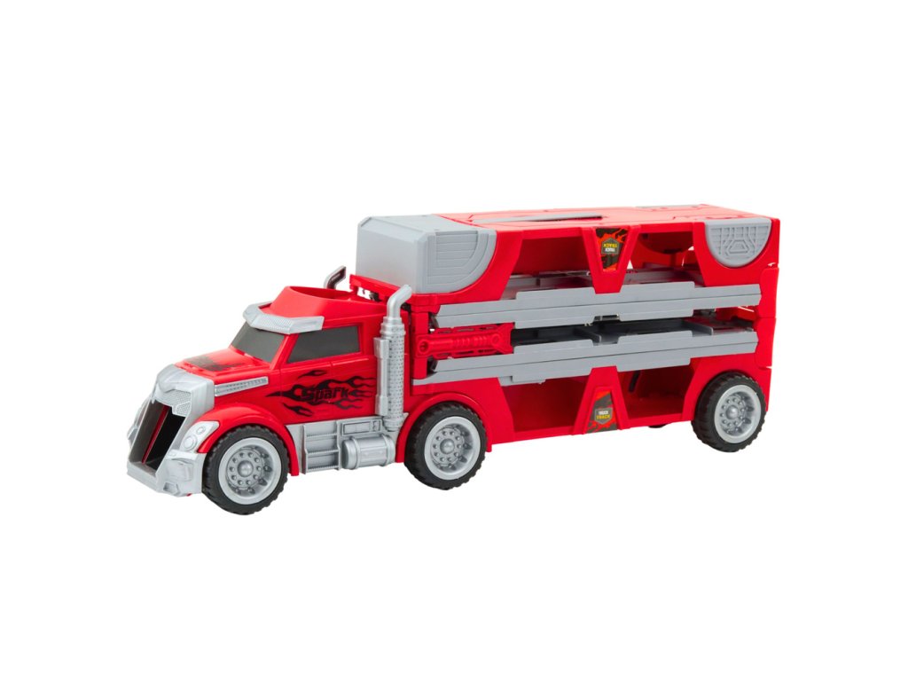 Po skončení zábavy lze náklaďák složit - přívěs zároveň slouží jako úložný prostor pro příslušenství a vozidla, což usnadňuje udržování pořádku v dětském pokoji. Sada je zabalena v barevné krabičce, ideální jako dárek.