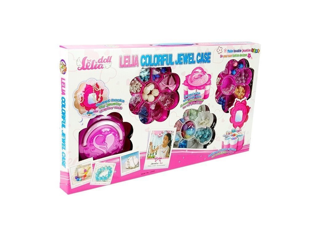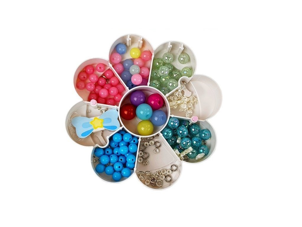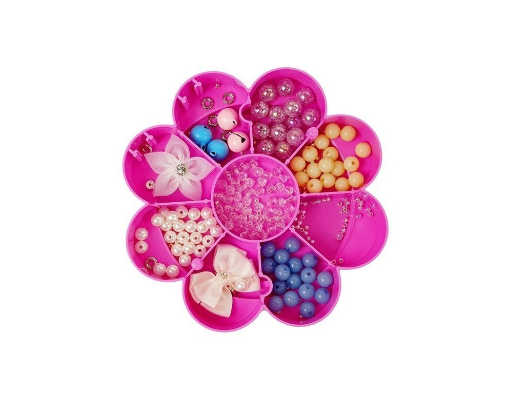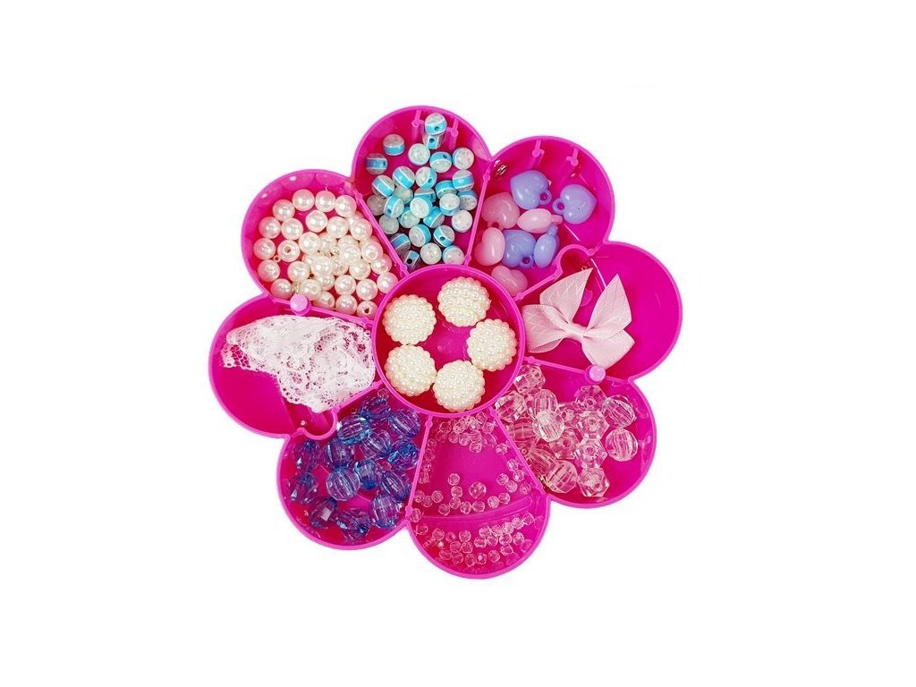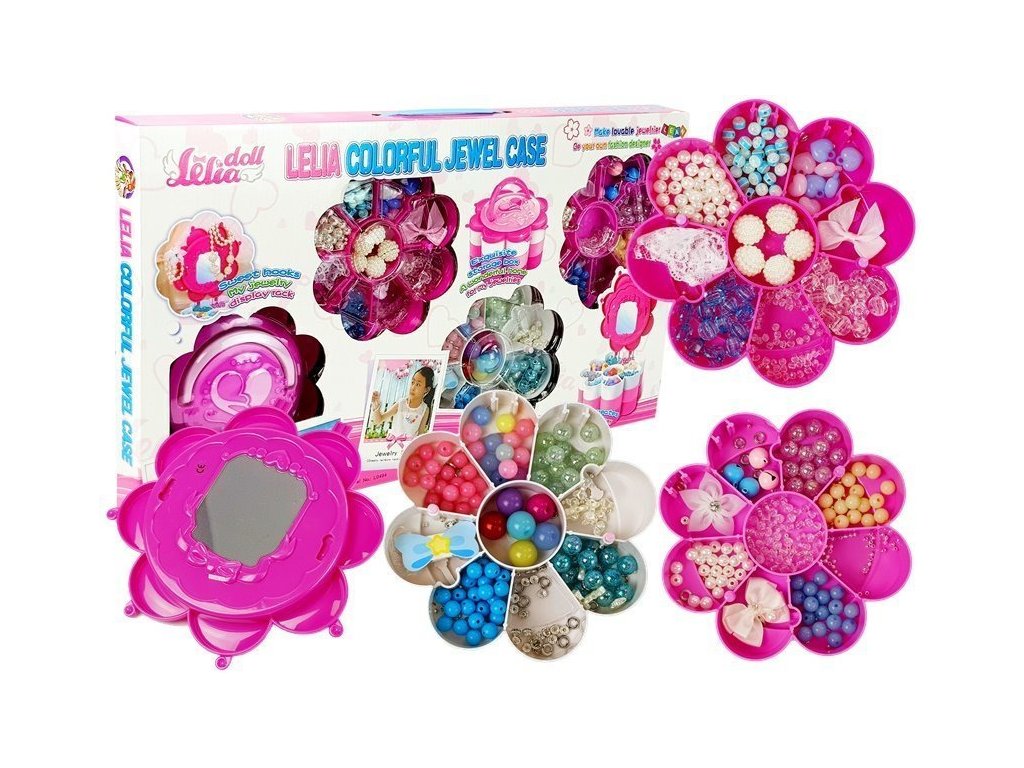 Nyní můžete mít všechny korálky na jednom místě a kdykoli budete chtít, můžete otevřít krabičku a začít vytvářet vlastní šperky. Krabice navíc obsahuje zrcátko, ve kterém budete obdivovat svá díla nebo vyšperkovat svou krásu. Vytvořte si svůj vlastní styl! Určitě se nejedna kamarádka zeptá, kde jsi sehnala tak krásný náramek nebo přívěsek. Růžovobílá krabička má tři patra ve tvaru květiny, kam můžete ukládat korálky. Na víčku je krásné srdíčko, ozdobí pokojíček nejedné holčičky.