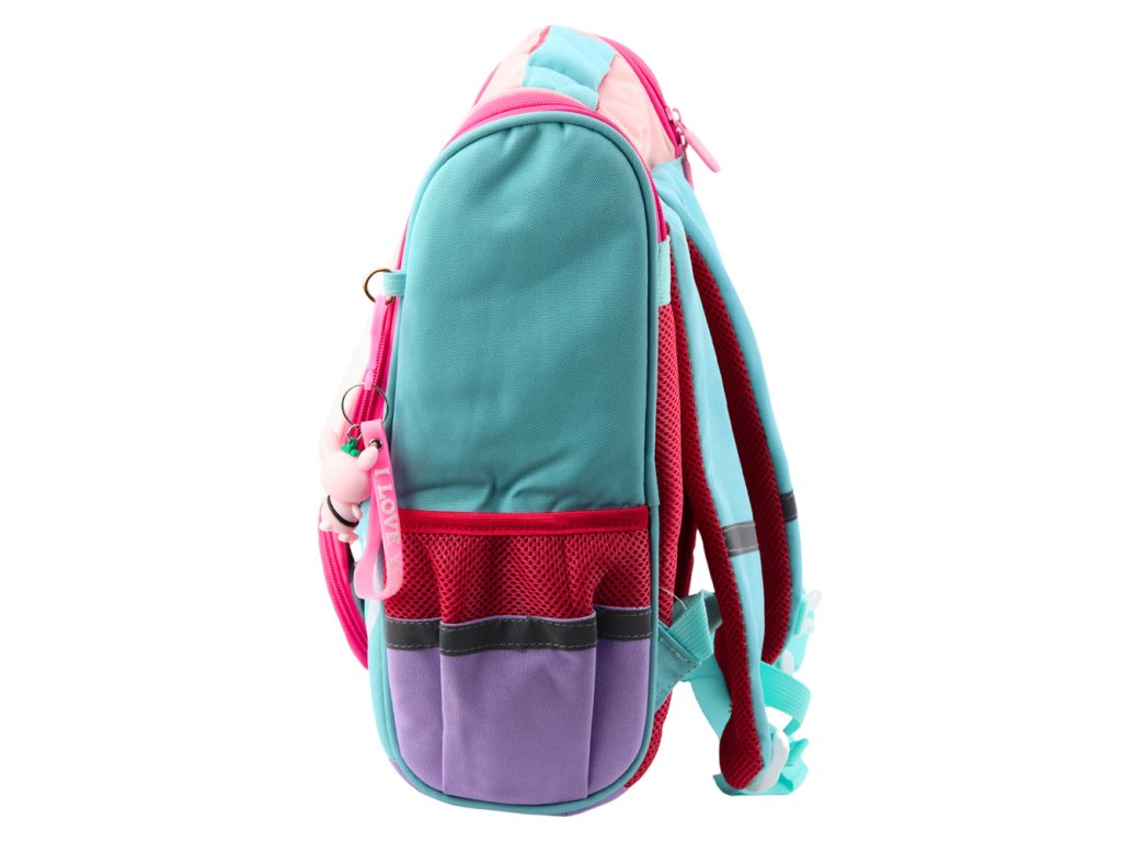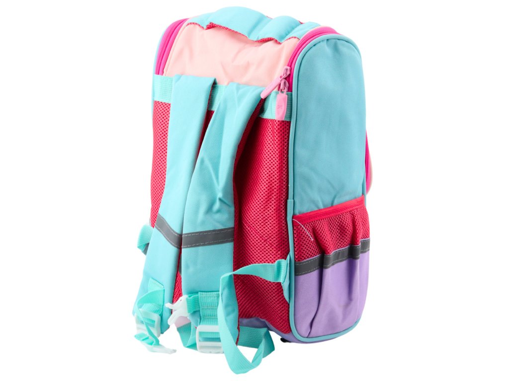Na bocích batohu jsou dvě elastické kapsy na láhev nebo láhev s vodou a hrudní popruh podporuje správné rozložení hmotnosti. Reflexní prvky zlepšují viditelnost dítěte na silnici.