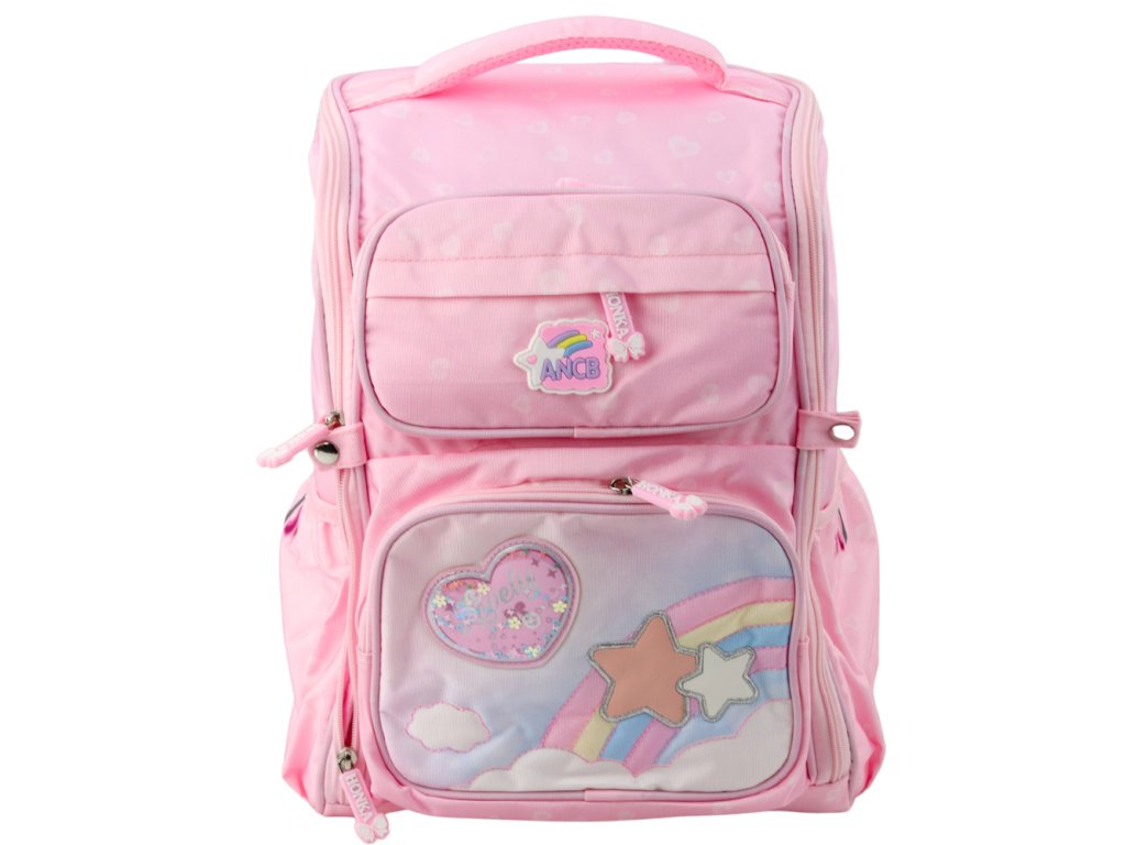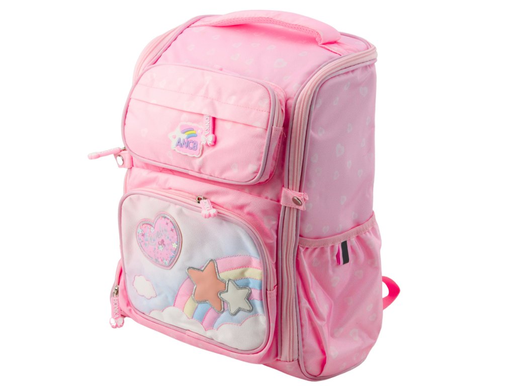 Batoh je vybaven jednou velkou hlavní komorou s širokým otvorem, která poskytuje snadný přístup do interiéru a pohodlné uložení knih, sešitů a větších předmětů. Na přední straně jsou další tři kapsy, ideální na penál, krabičku na oběd nebo příslušenství. Po stranách jsou dvě elastické kapsy na láhev nebo láhev s vodou.