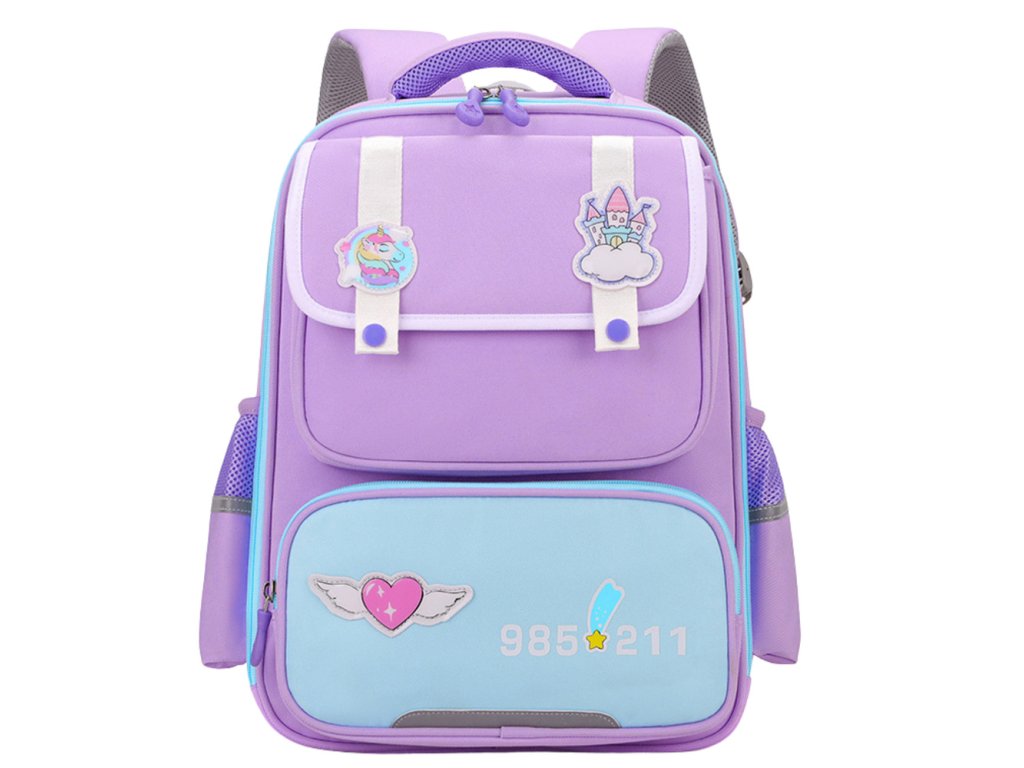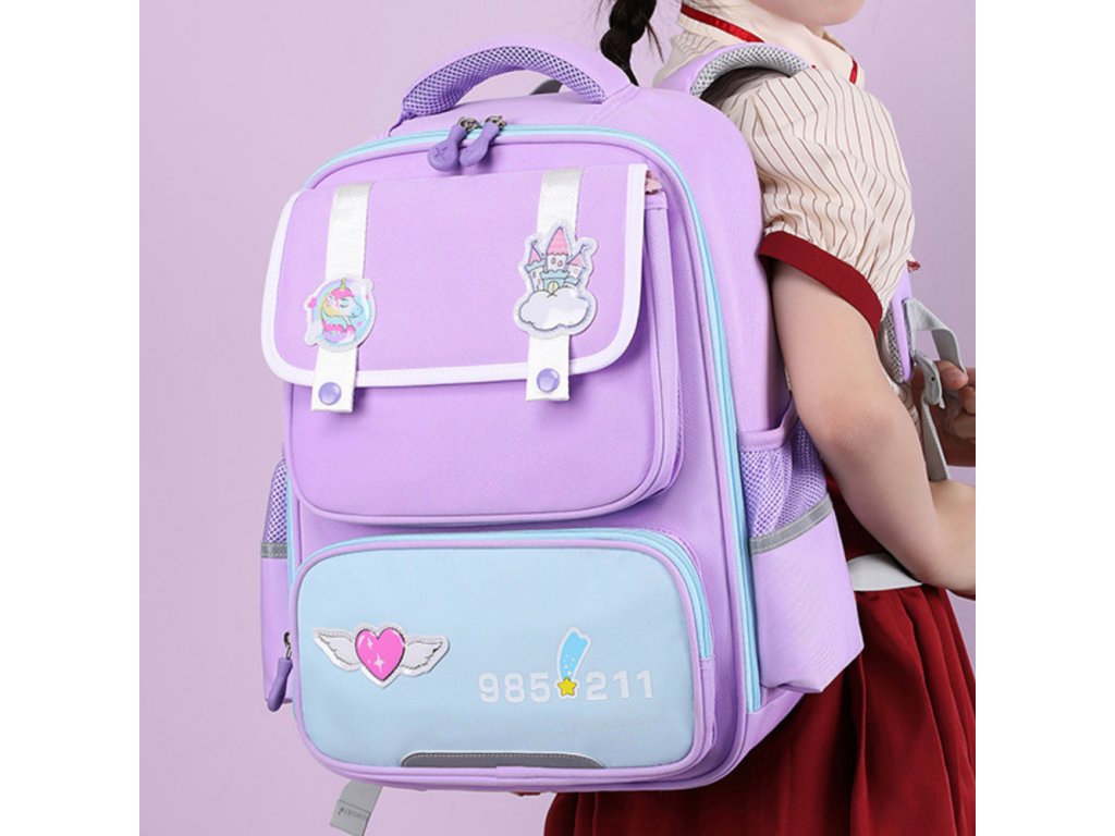 Fialový školní batoh s barevnými nášivkami ve tvaru hradu, jednorožce a srdce je spojením funkčnosti a pohádkového stylu, který jistě osloví každého malého studenta. Vyrobeno z odolného materiálu, bude dobře fungovat při každodenním používání ve škole i venku.