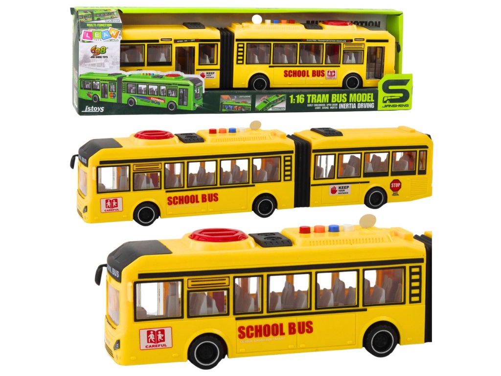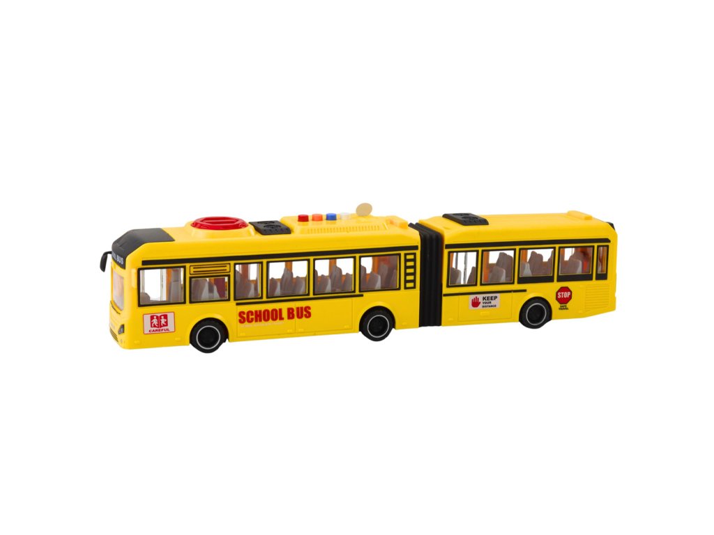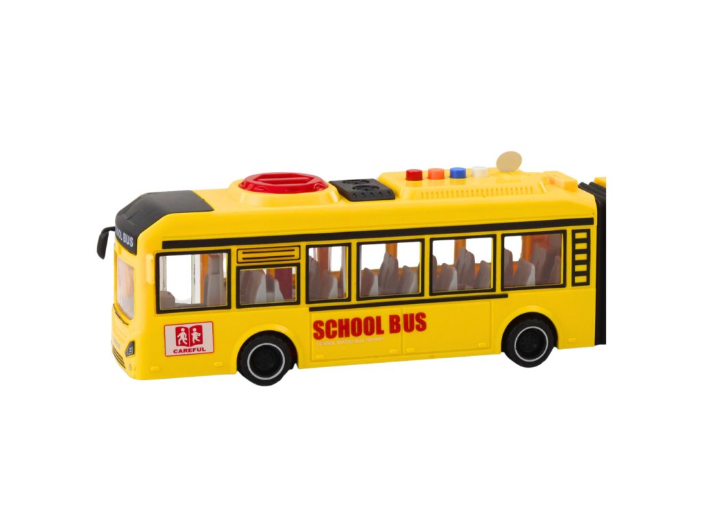 Školní kloubový autobus otevírací dveře, světla, zvuky, žlutý 1:16