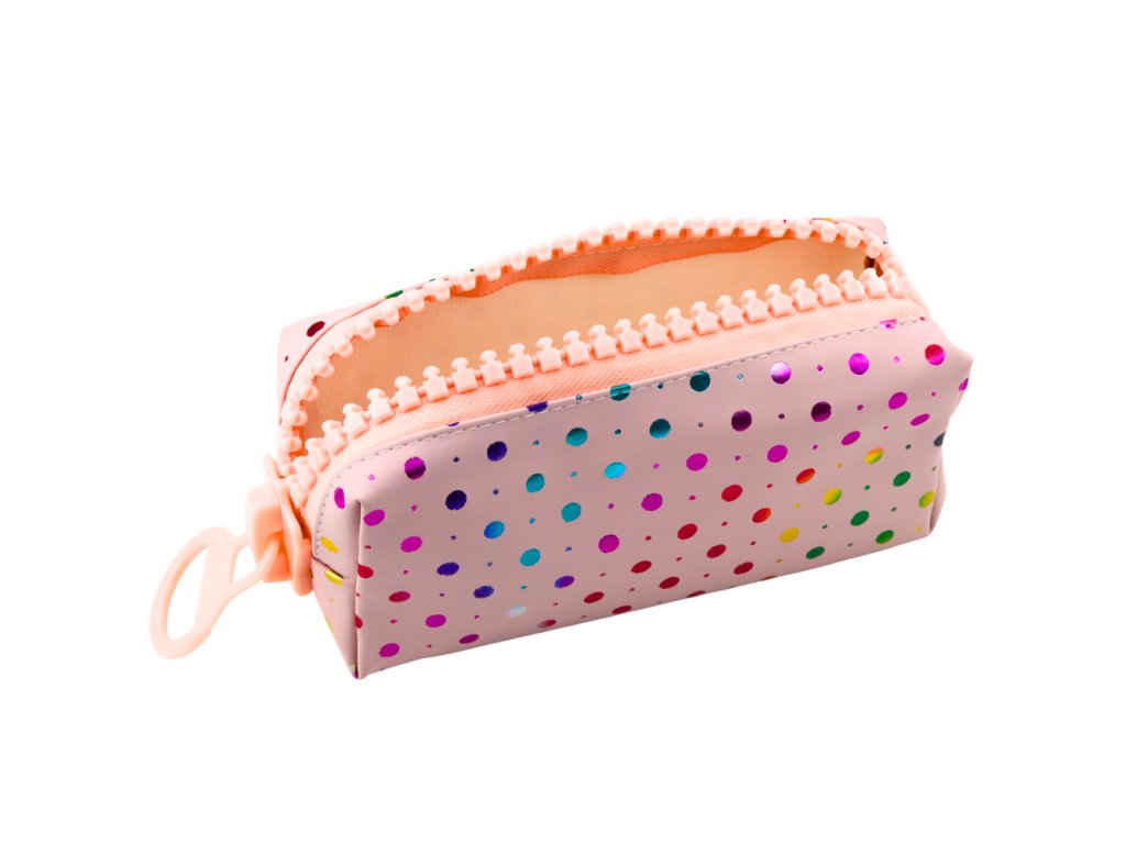 Školní penál v pastelově růžové barvě s barevnými tečkami je spojením okouzlující estetiky s praktickým řešením pro ukládání doplňků. Svým moderním a veselým designem dokonale vyniká od ostatních penálů a přitahuje pozornost dětí a mladých lidí, kteří ocení originální styl.