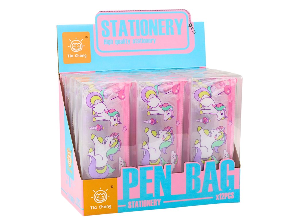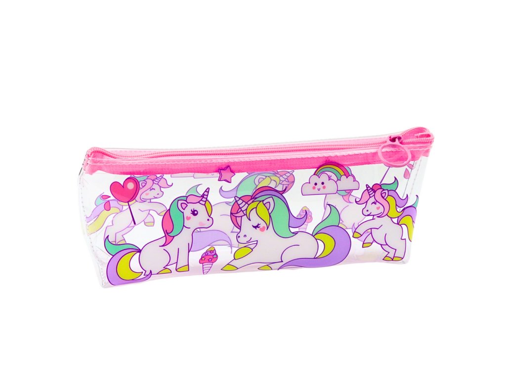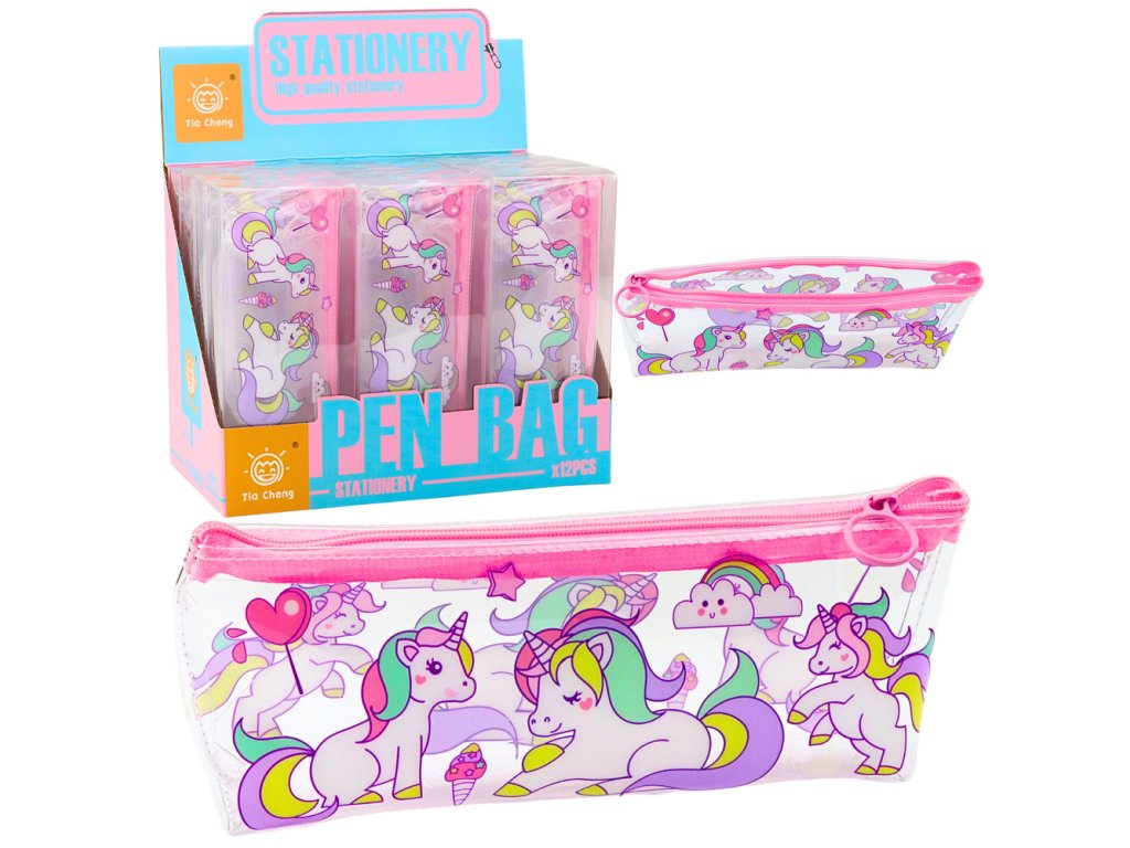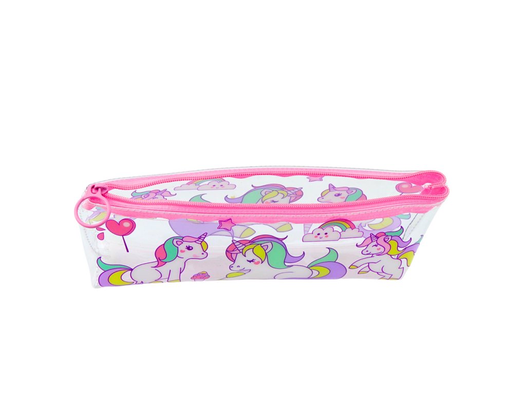 Průhledný penál s barevnými jednorožci je okouzlujícím a praktickým doplňkem každého studenta. Díky své pohádkové grafice a pastelovým barvám upoutá pozornost a dokonale ladí s dětskou školní stavebnicí.