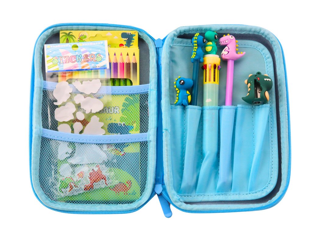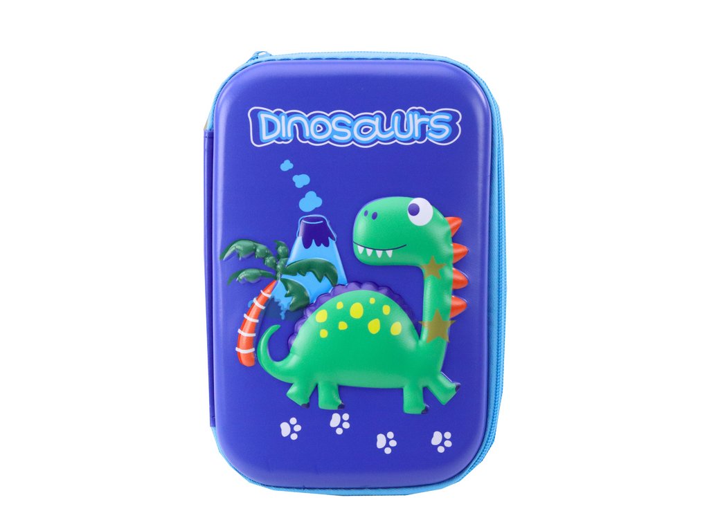 Školní penál s dinosaurem, modrý, s příslušenstvím