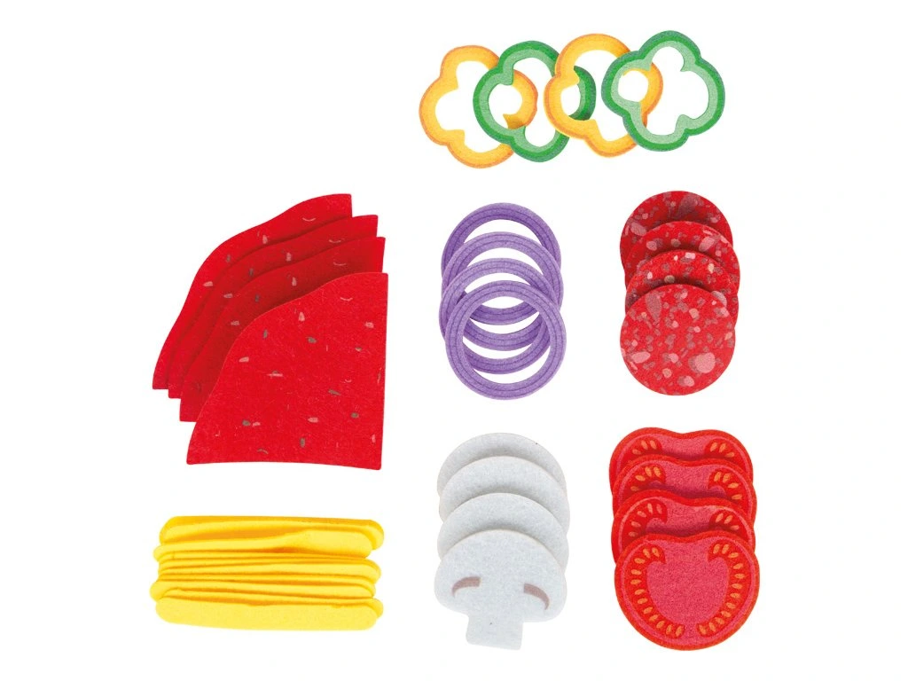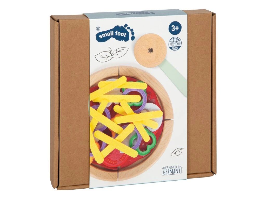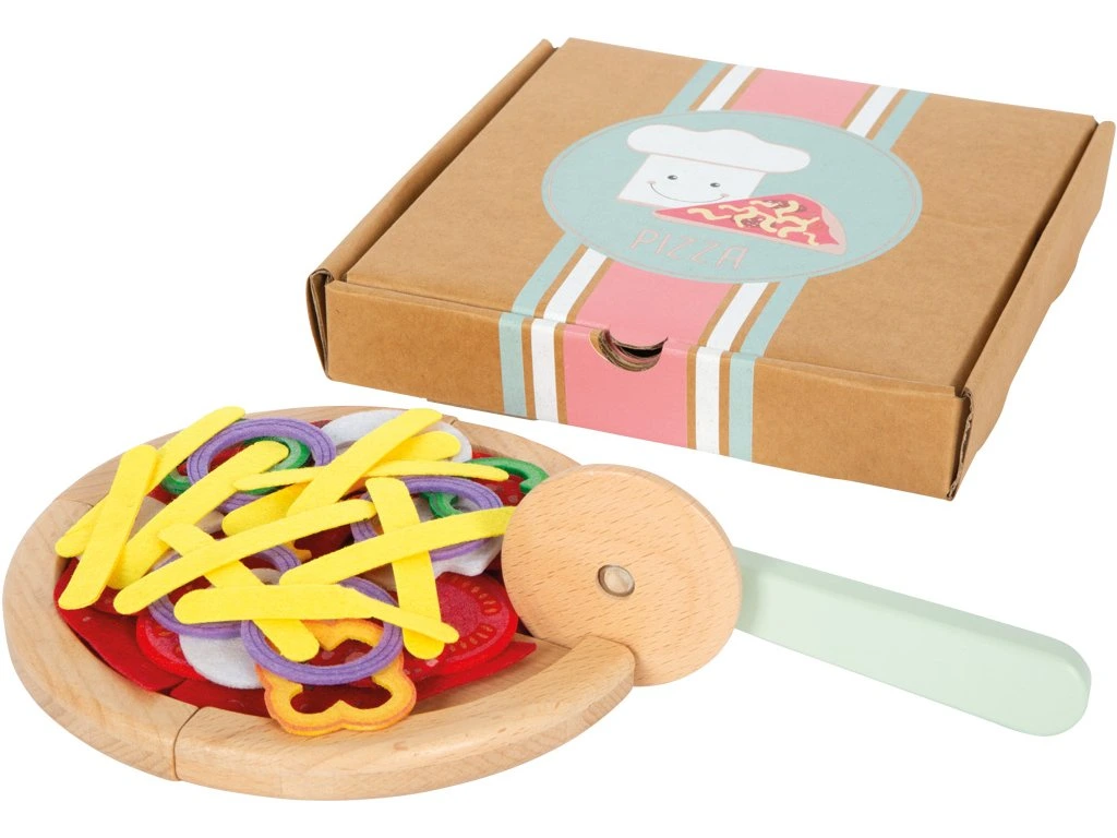 Dnes je čas na pizzu! Skvělá zábava pro malé kuchaře! Tato pevná kartonová krabice na pizzu s veselým potiskem ukrývá vše, co děti potřebují k přípravě vlastní pizzy. Uvnitř najdou čtyři dřevěné plátky pizzy, které jsou spojeny suchým zipem – dají se tedy snadno „nakrájet“ pomocí přiloženého dřevěného kráječe. Stejně jako opravdová pizza! Sada obsahuje i různé plstěné ingredience: cibuli, houby, papriku, rajčata, klobásu a sýr. Nechybí ani oboustranná rajčatová omáčka – z jedné strany s potiskem bylinek, z druhé bez. Děti si tak mohou pizzu upravovat podle vlastní fantazie znovu a znovu. Hra podporuje jemnou motoriku, kreativitu i rozvoj sociálních dovedností při společné hře. Skvěle se hodí jako doplněk do dětské kuchyňky nebo k samostatnému hraní na pizzéra. Krabice slouží nejen ke hře, ale i k uložení všech dílů. Díky tomu je hračka snadno skladná a děti mají po hraní uklizeno raz dva. Hlavní vlastnosti: trénuje motoriku, aktivní hraní rolí a rozvoj sociálních dovednostívhodné do každé dětské kuchyňky odolná krabice na pizzu pro hraní a skladování kusy pizzy jsou spojeny suchým zipemDoplňkové parametry