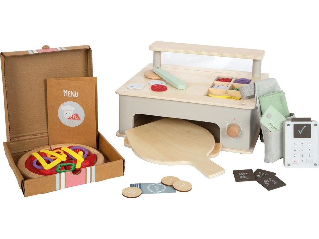 Pečte a prodávejte pizzu jako skutečný profesionál! Robustní dřevěná pec na pizzu slouží nejen jako pec na pizzu, ale také jako spíž a prodejní pult v jednom. Obsahuje praktické přihrádky na ingredience na pizzu. Herní sada nabízí vše, co malí kuchaři a majitelé restaurací potřebují pro typickou pizzerii – od kráječe až po jídelní lístek s cenami a ceníky pro jejich vlastní malou pizzerii. Rozmanité ingredience na pizzu jako je cibule, houby, paprika, rajčata, klobása, sýr a rajčatová omáčka, vyrobené z plsti, umožňují mnoho nápaditých pizzových kreací. Plátky pizzy z masivního dřeva jsou spojeny suchým zipem a lze je snadno oddělit pomocí krájecího kolečka. Vrcholem autentického herního zážitku je kapsa na opasek, která nabízí prostor pro peněženku číšníka, včetně hracích peněz a moderní čtečku karet. Součástí je také krabice na pizzu. Pec na pizzu má cvakavý zvuk pro lepší zábavu. Tuto sadu charakterizuje design vhodný pro děti, vysoká herní hodnota a vzdělávací hodnota, která je zároveň užitečným doplňkem každé dětské kuchyně. Aktivní hraní rolí podporuje motorické dovednosti, sociální dovednosti a hravou formou procvičuje každodenní dovednosti. Hlavní vlastnosti: trénuje motorikupodporuje aktivní hraní rolí a rozvoj sociálních dovedností při hřecvakavý zvuk při otáčení knoflíkuvhodné do každé dětské kuchyňkyDoplňkové parametry