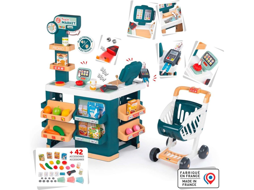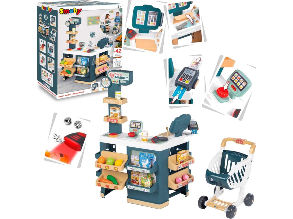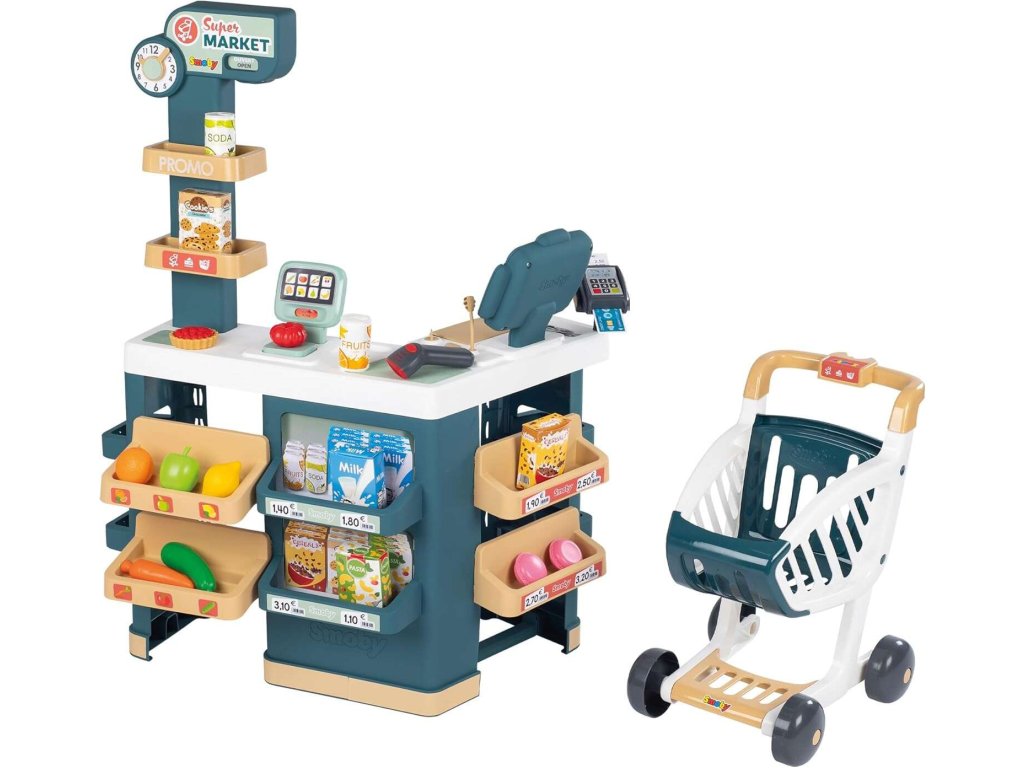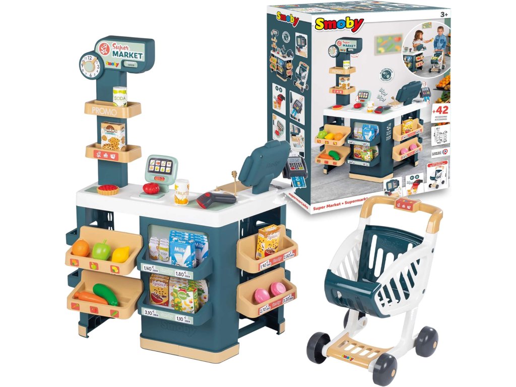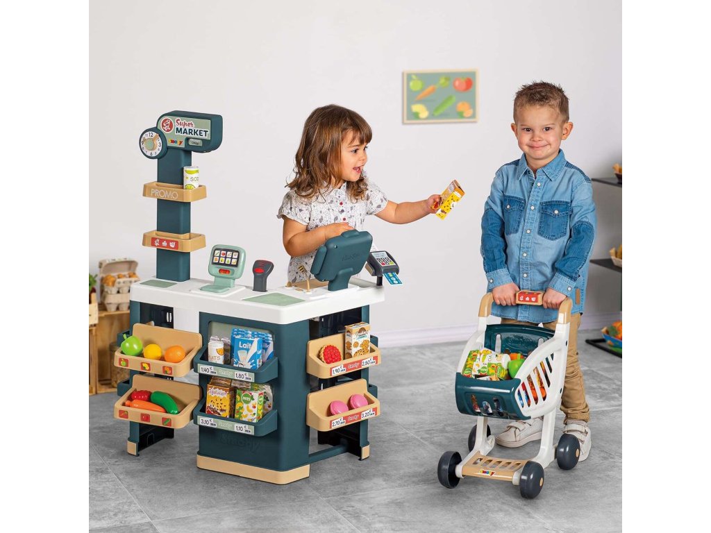 Smoby Supermarket je kompletní sada s více než 40 doplňky, díky nimž je hra ještě realističtější. Obsahuje pokladnu s funkcí skenování, platební terminál a regály plné imitací potravin. Sada je navíc vybavena nákupním vozíkem, takže si děti mohou zahrát na prodavače i zákazníka.