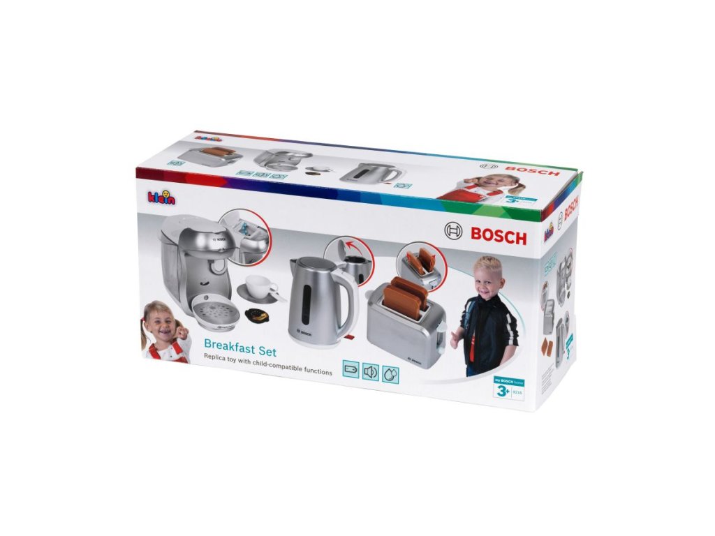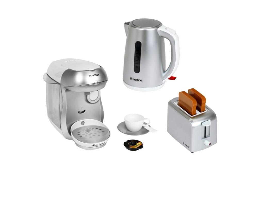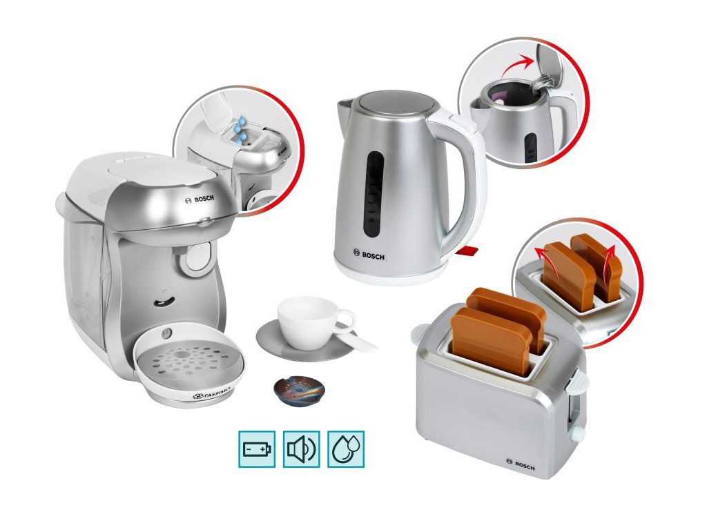 Snídaňová sada Bosch stříbrná – dětská konvice, toustovač, kávovar, zvuk 3+