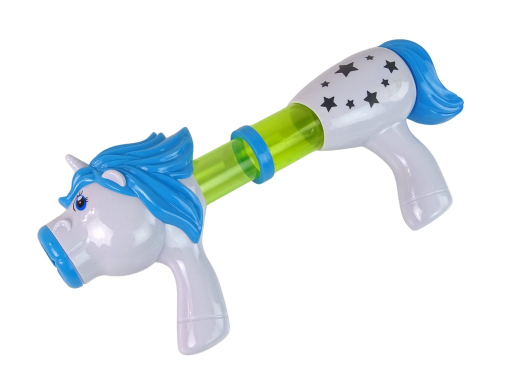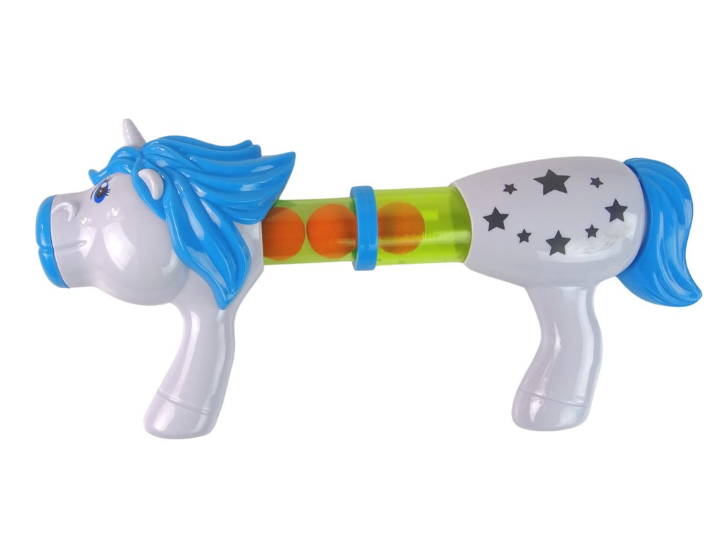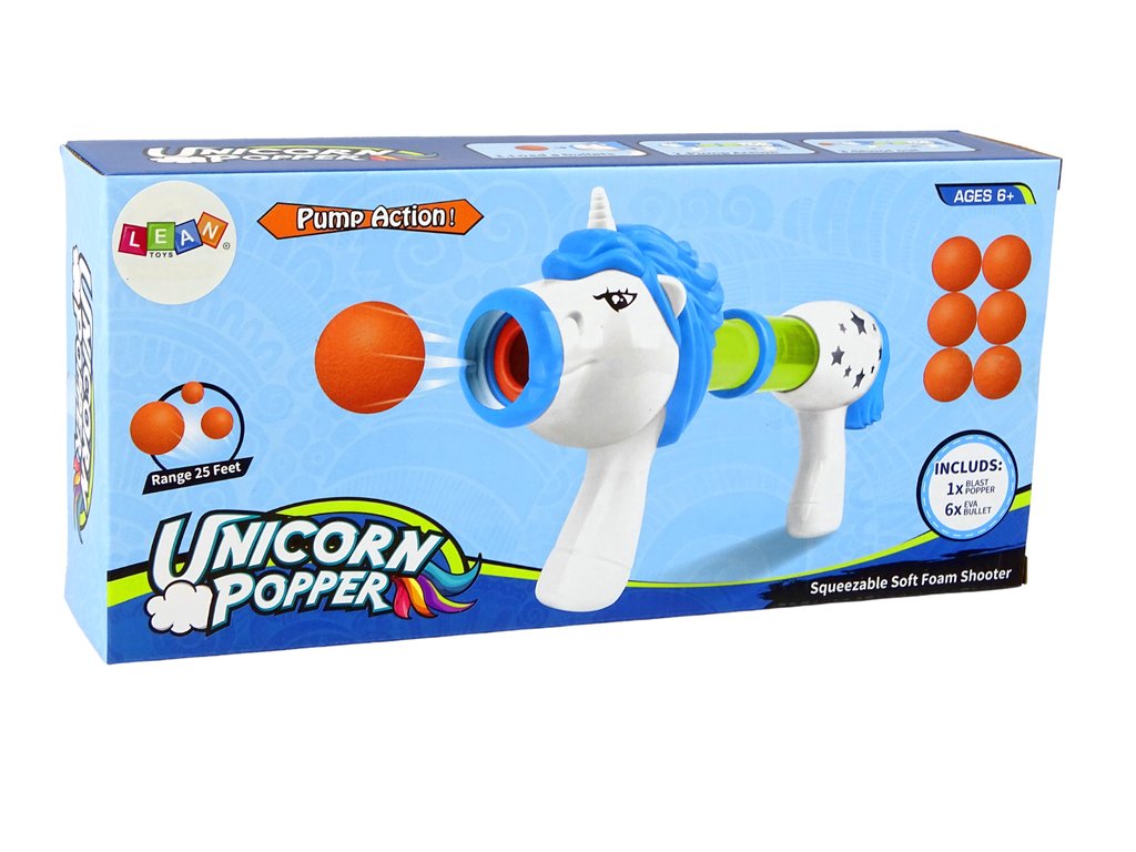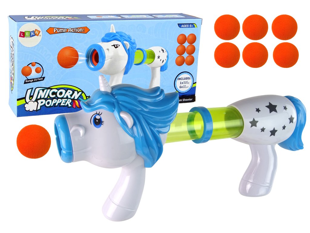 Hračka zobrazuje jednorožce a je chována v bílé a modré barvě. Zásobník, ve kterém jsou kuličky umístěny, je průsvitný, takže můžete snadno sledovat počet ještě dostupných nábojů. Jednoduchým vložením kuliček do zásobníku se vysune a zasune spoušť a odpor vzduchu tlačí koule dopředu. Puška umožňuje bezpečnou střelbu i na značné vzdálenosti. Součástí je šest nábojů, takže se nemusíte bát, že vám dojde munice. Pomocí očíslovaných kbelíků, které jsou součástí balení, si vaše dítě může procvičit přesnost svých střel.
