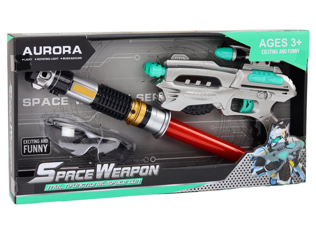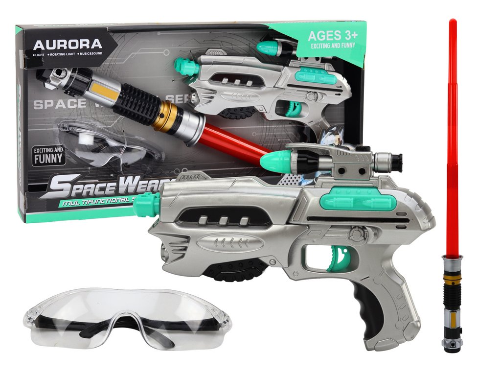 Tato jedinečná sada obsahuje zbraň, světelný meč a ochranné brýle. Pistole vybavená zvukovými efekty a zvuky výstřelů vás vezme přímo do horkých vesmírných bitev. Když pustíte výstřel, budete se cítit jako skutečný vesmírný válečník, připravený bojovat o přežití!