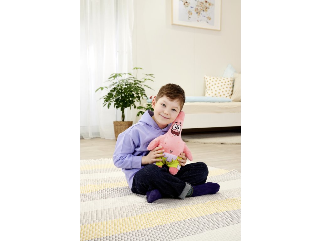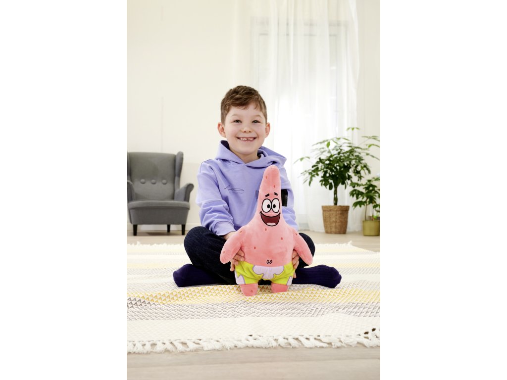 Hvězdice Patrick je růžová, má limetkově zelené šortky s fialovými akcenty. Usmívá se a má velké oči. Plyšová hračka je měkká a příjemná na dotek.