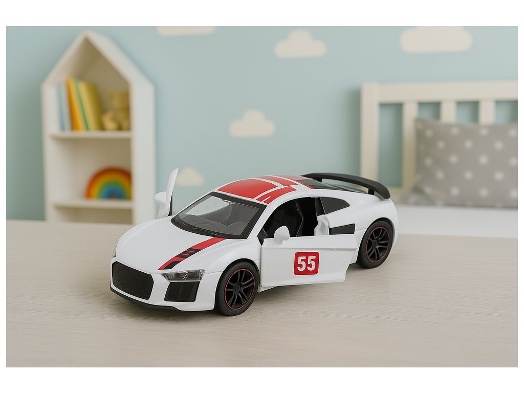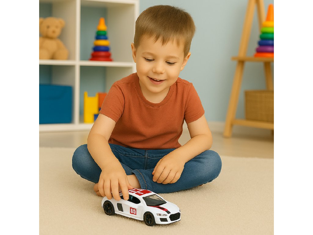 Toto kovové sportovní auto v měřítku 1:43 je realisticky reprodukovaný model, vytvořený pro děti, které si rády hrají s vozidly, a pro sběratele, kteří oceňují estetiku. Hračka je vyrobena z vysoce kvalitního kovu, což zajišťuje odolnost a atraktivní vzhled připomínající skutečný závodní vůz. Bílá karoserie s červenými akcenty dodává modelu dynamický charakter a otevírací dveře dále umocňují realismus hry a umožňují dětem přehrávat si různé scény.