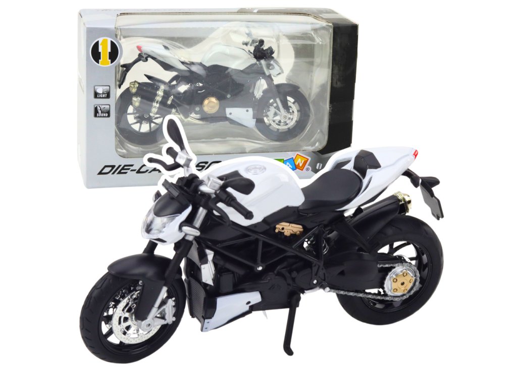 Model je vybaven světelnými a zvukovými efekty, které se aktivují díky napájení 3x AG13 (součástí balení). Další funkce zvyšují realističnost hry, díky čemuž motocykl vypadá a zní jako skutečné vozidlo. Dynamický, sportovní design v bílé barvě je inspirován klasickými závodními motocykly, což mu dodává autentický charakter.