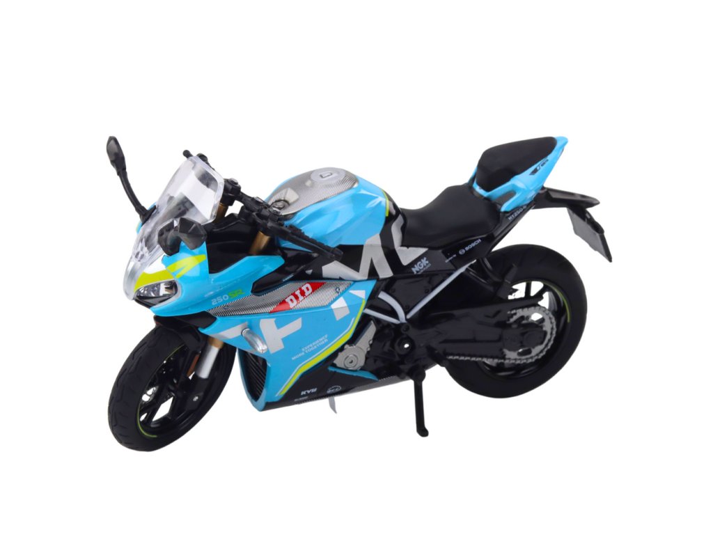 Model je vybaven světelnými a zvukovými efekty, které se aktivují díky napájení 3x AG13 (součástí balení). Další funkce zvyšují realističnost hry, díky čemuž motocykl vypadá a zní jako skutečné vozidlo. Dynamický, sportovní design v modré barvě je inspirován klasickými závodními motocykly, což mu dodává autentický charakter.