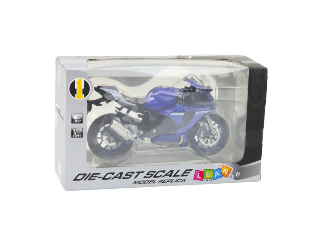 Model je vybaven světelnými a zvukovými efekty, které se aktivují díky napájení 3x AG13 (součástí balení). Další funkce zvyšují realističnost hry, díky čemuž motocykl vypadá a zní jako skutečné vozidlo. Dynamický, sportovní design v tmavě modré barvě je inspirován klasickými závodními motocykly, což mu dodává autentický charakter.