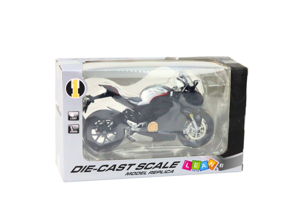 Sportovní motorka kovová světla zvuky stříbrná s černými prvky V4 1:12