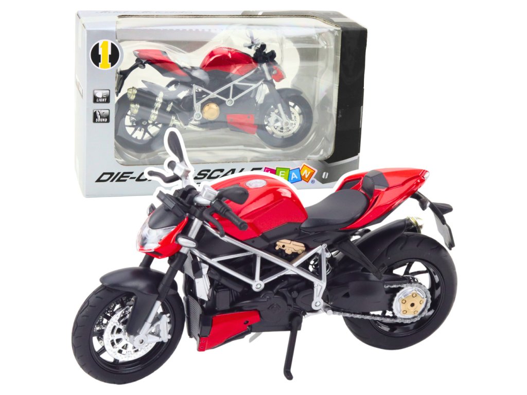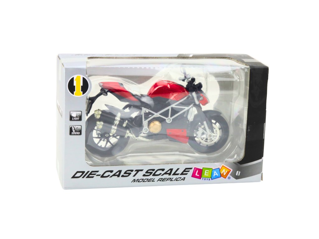 Model je vybaven světelnými a zvukovými efekty, které se aktivují díky napájení 3x AG13 (součástí balení). Další funkce zvyšují realističnost hry, díky čemuž motocykl vypadá a zní jako skutečné vozidlo. Dynamický, sportovní design v červené barvě je inspirován klasickými závodními motocykly, což mu dodává autentický charakter.