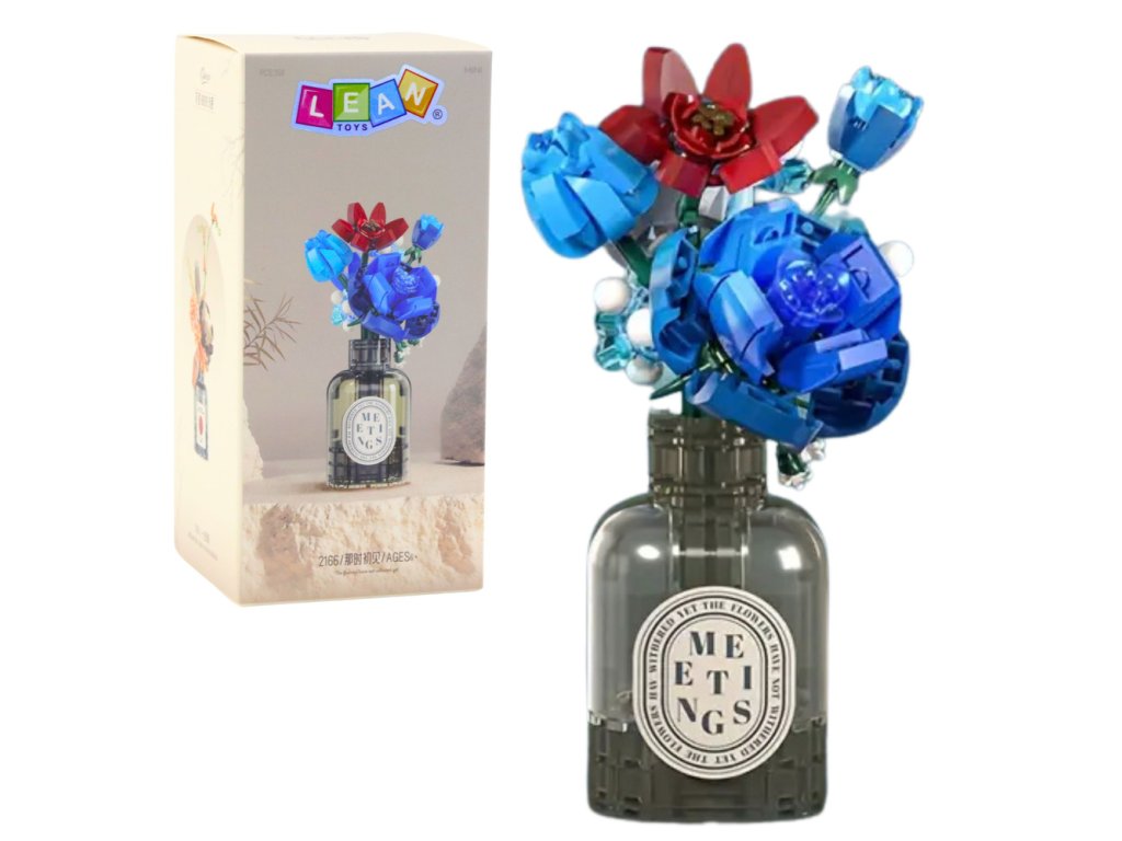 Tato stavebnice ve tvaru barevné kytice ve skleněné láhvi je jedinečnou kombinací kreativní hry a elegantní dekorace interiéru. Model zdobený v chladných modrých a červených tónech přitahuje pozornost precizním zpracováním, barevným kontrastem a estetickým tvarem.