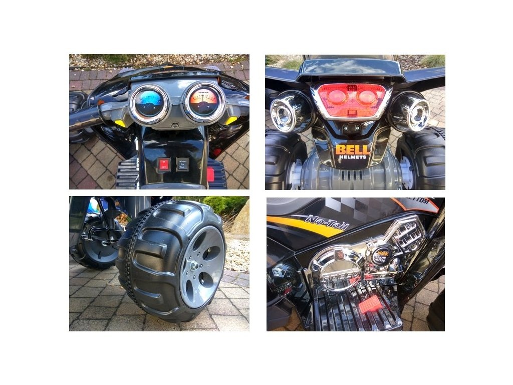 Nová čtyřkolka v černé barvě je poháněna baterií 12V7Ah a motorem 2x45W. Jeep má moderní a divoký design. Má dva rychlostní stupně vzad a vpřed, ale také automatickou brzdu po uvolnění plynového pedálu.