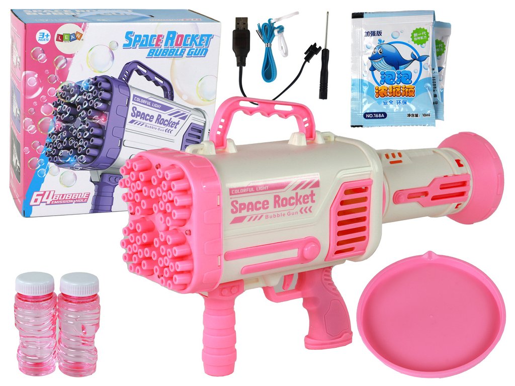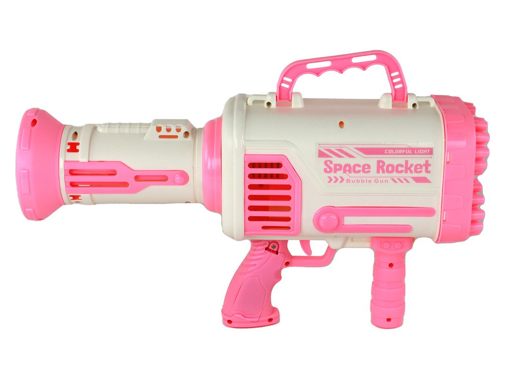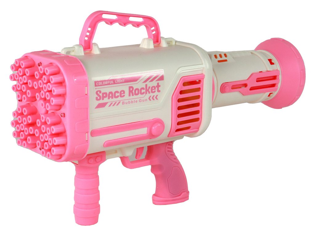 Pistole na mýdlové bubliny v bílé a růžové barvě má poutavý design. Je navržen tak, aby připomínal skutečnou pušku, ale místo střelby kuliček vytváří krásné mýdlové bubliny.