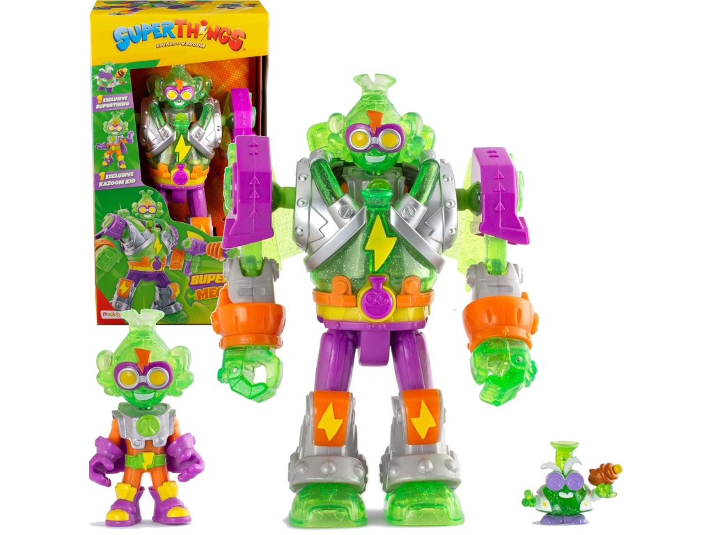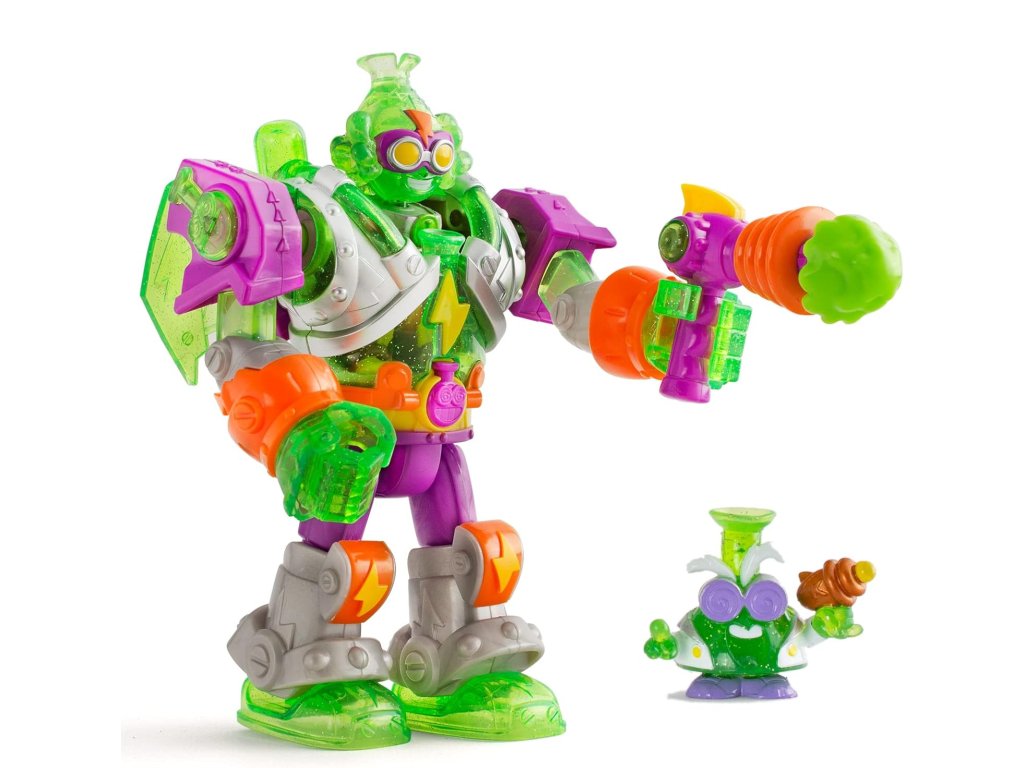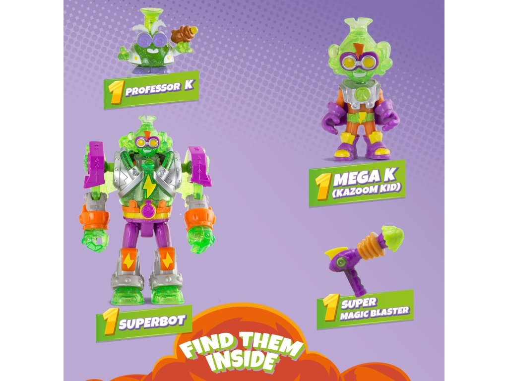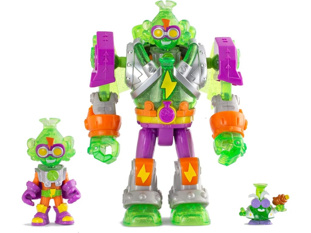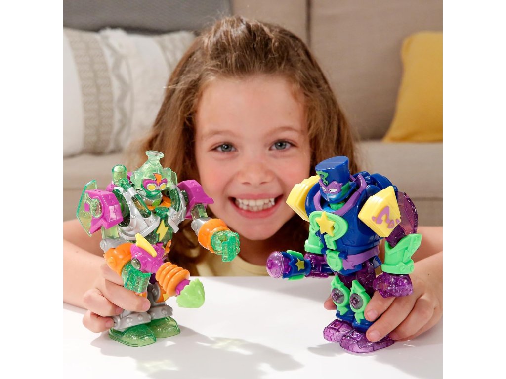 - 1 Robo‑Superbot Mega‑K– vícebarevný robotický padouch s živými kontrastními barvami (zelené a fialové tělo s oranžovými akcenty a charakteristické žluté oči).
