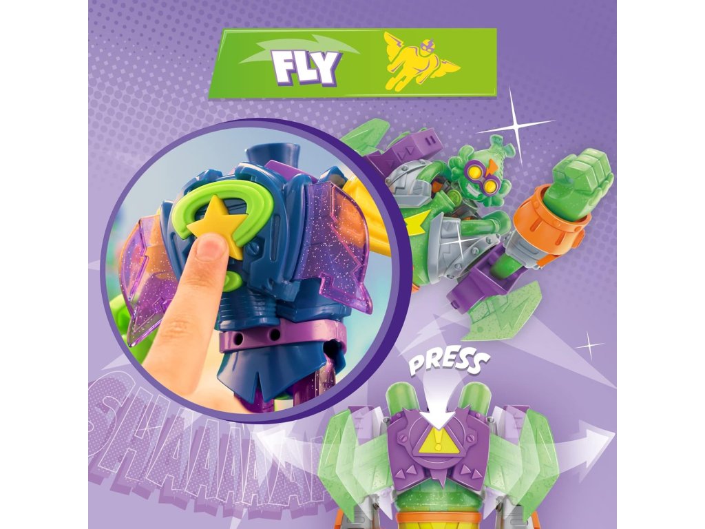 - Bojové příslušenství: Kazoom zbraně a další bojové moduly vám umožní znovu vytvořit bitevní scény mezi hrdiny a padouchy ze světa SuperThings.