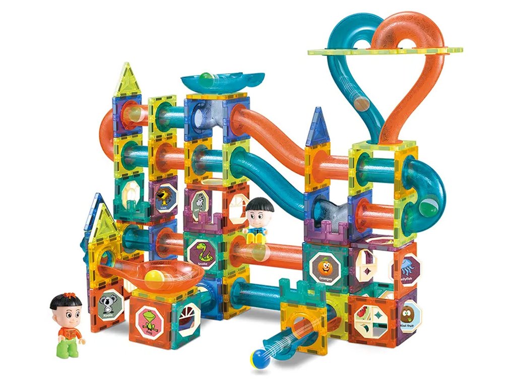 Svítící skluzavka na míčky je vzrušující hračka pro děti, která poskytne hodiny zábavy a zábavy. Kombinuje dva typy hraček dohromady - magnetické bloky a skluzavku na míčky. Hračka má výchovnou funkci. Umožňuje rozvoj manuálních dovedností při stavbě dráhy, kreativitu a podporuje experimentování a tvorbu stále novějších budov a staveb.