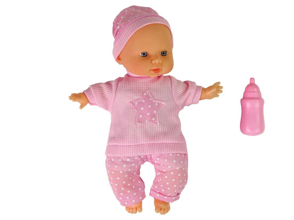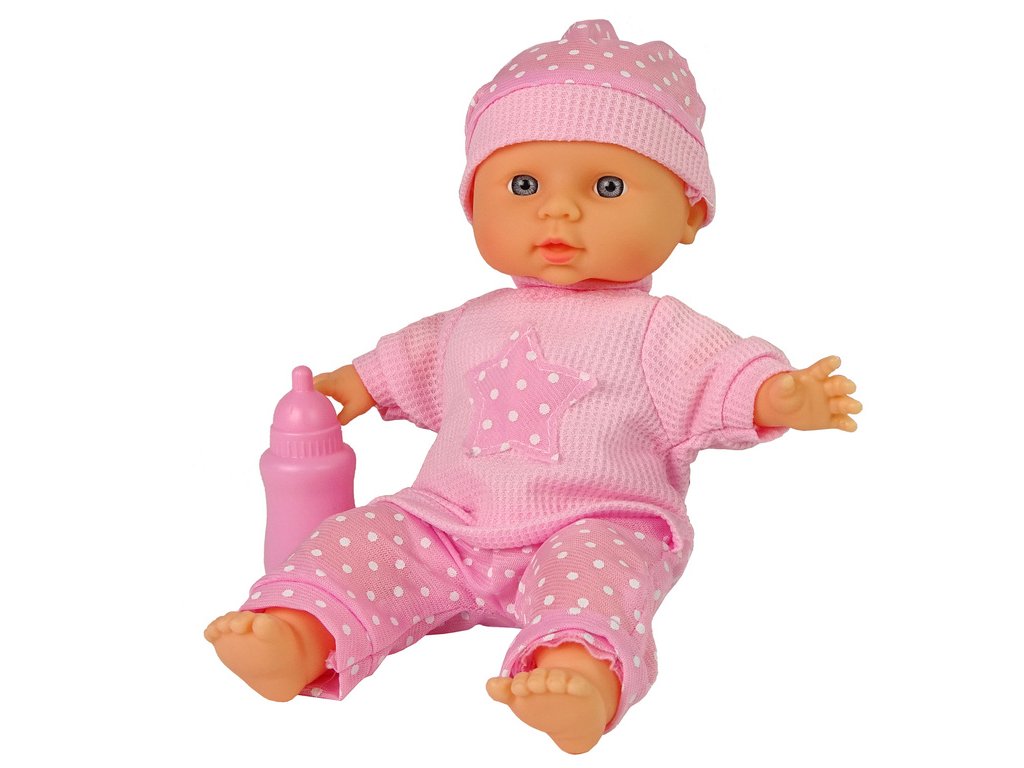Panenka je oblečená v růžovém tečkovaném pyžamu. Na hlavičce miminka je krásná čepice. Celek do sebe dokonale zapadá. Po přitlačení na trup panenky slyšíme zvuky charakteristické pro malé dítě: pláč, žvatlání, slovo "maminka" atd. Při každém stisknutí vás překvapí zvukem. S každým stisknutím překvapí zvuky. Panenka má pohyblivé ruce a nohy, oblečení je snímatelné, takže si můžete vyměnit šatník.