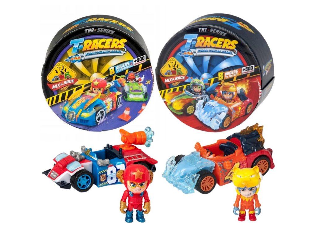 T-Racers Mix&Race Turbo Tuning Týmy Auta Sada překvapení Series 1 + Series 2Zažijte vzrušení ze závodění s T-Racers. Ke sbírání je 8 modelů aut a 8 figurek řidičů v řadě 1 i 2. Uvnitř každého turbo kola je 5 sáčků s překvapením s díly pro sestavení vlastního vozidla. Všechny díly jsou zaměnitelné s jinými T-Racery, což umožňuje více než 500 možných kombinací!