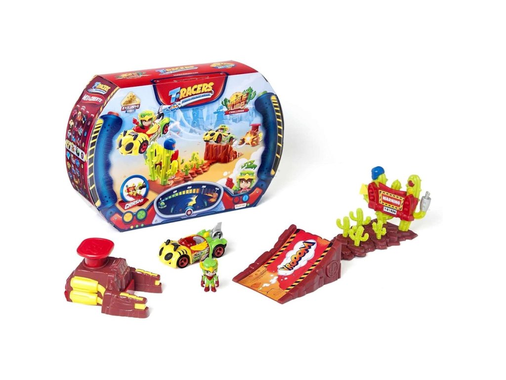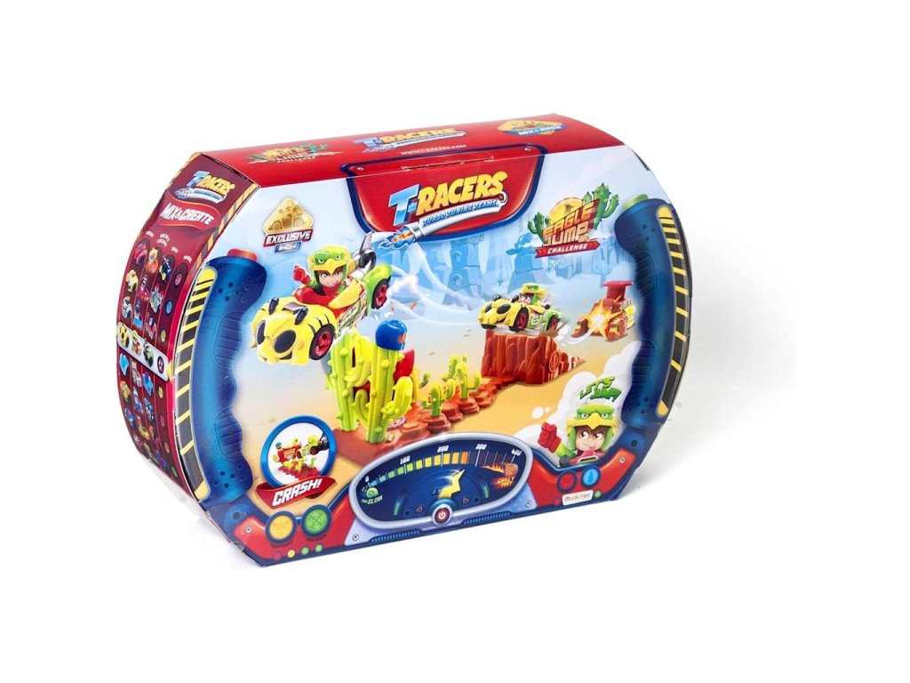 T-Racers - Eagle Jump Set Launcher Launch Vehicle + Figurka 015711T-Racers budou čelit své první výzvě v Eagle Jump Challenge! Dokáže Wing Speed na plném slunci uprostřed pouště překonat kaktusovou zónu a pokračovat v závodě? Umístěte své T-Racery na odpalovací zařízení, zamiřte, zkalibrujte sílu... a vzlétněte! Podaří se vám přeskočit kaktusovou bariéru, nebo na ni vaše auto nabourá či spadne? Vítězství v tomto testu je ve vašich rukou! Pamatujte, že každý díl lze zaměnit s jinými T-Racery, včetně kol, a dát tak každému vozidlu individuální charakter. V sérii T-Racers existuje více než 500 různých možných kombinací!