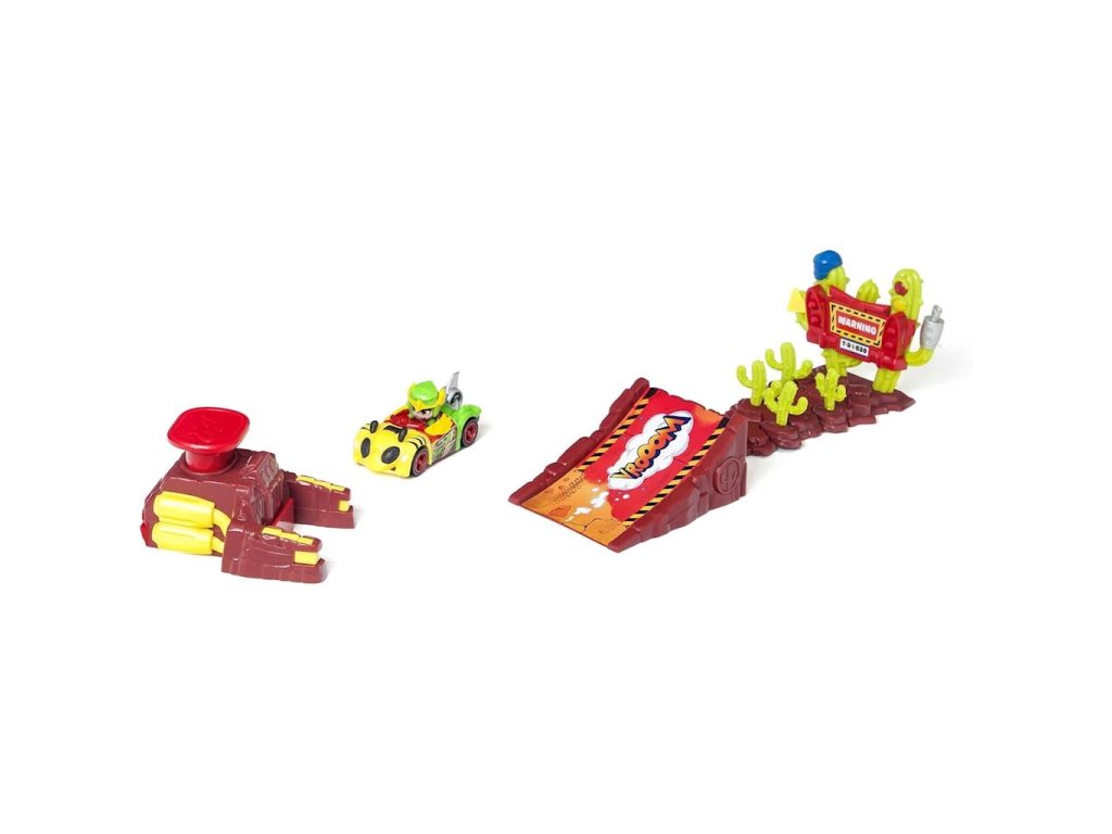 T-Racers Eagle Jump Launcher + Mega Striker sada vozidel 2v1T-Racers budou čelit své první výzvě v Eagle Jump Challenge! Dokáže Wing Speed uprostřed pouště na plném slunci překonat kaktusovou zónu a pokračovat v závodě? Umístěte T-Racer na odpalovací zařízení, zamiřte, zkalibrujte výkon... a vzlétněte! Podaří se vám přeskočit kaktusovou bariéru, nebo do ní auto narazí či spadne? Vítězství v tomto testu je ve vašich rukou! Pamatujte, že každý díl lze vyměnit s jinými T-Racery, včetně kol, což dává každému vozidlu individuální charakter. V sérii T-Racers existuje více než 500 různých možných kombinací!