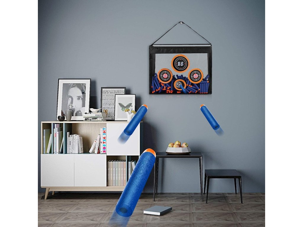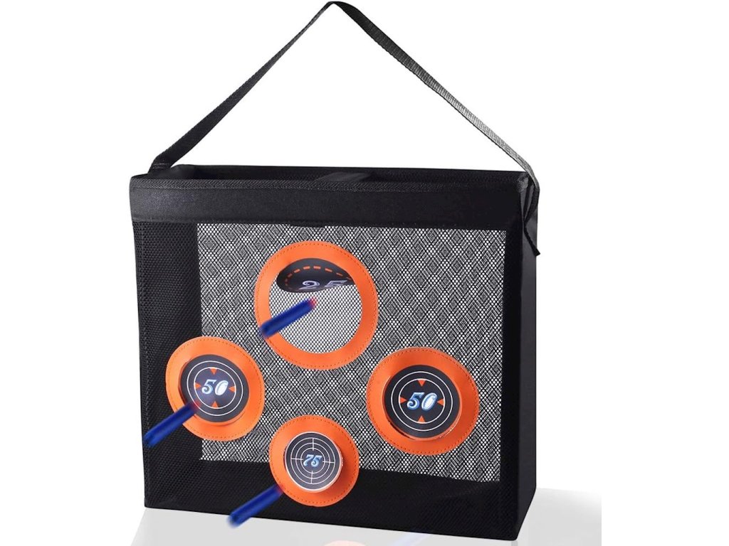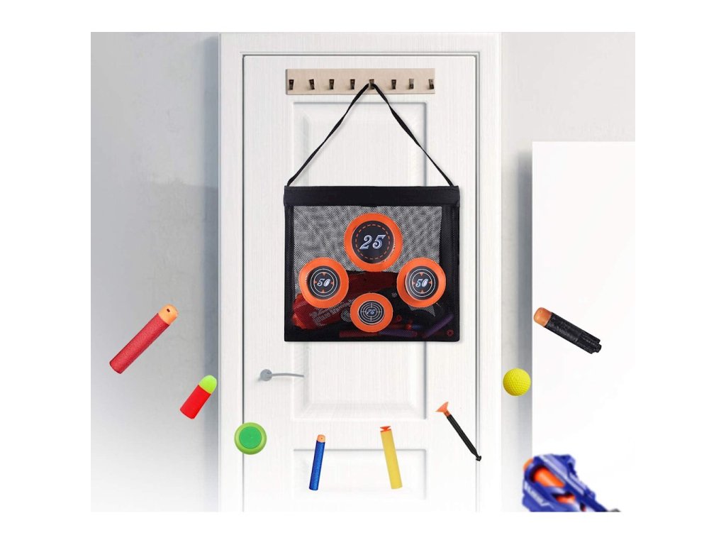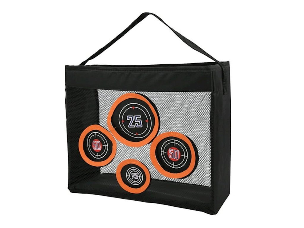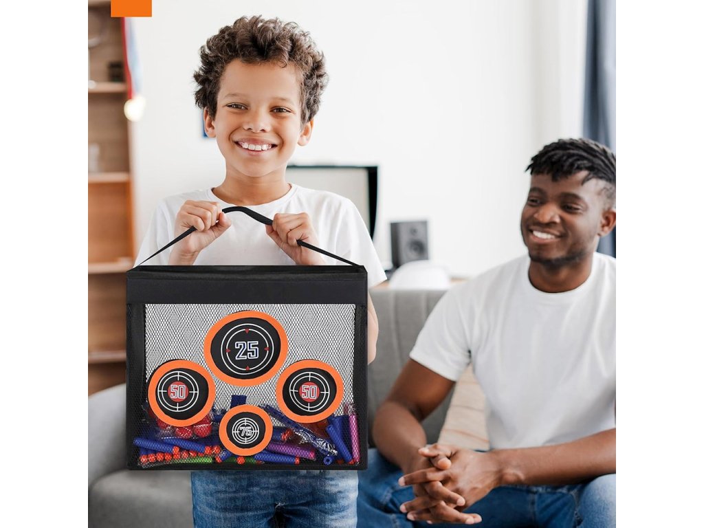 Nerf Target Bag s prostorem pro šipky a příslušenství, s držákem na 4 terčeZůstaňte ve hře s touto taškou na příslušenství, která je také perfektním přenosným terčem se 4 terči pro hry Nerf! Díky praktické rukojeti si jej hráči mohou vzít kamkoli a kamkoli zavěsit. Síť zachytí každou šipku a je ideální pro uložení různého příslušenství. Připravte se na rychlou akci, ať jste kdekoli!