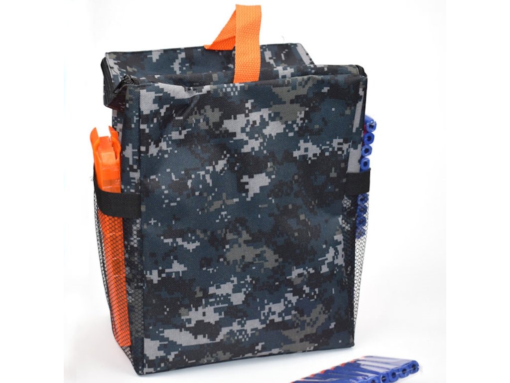 Zde je prostorná taška, která pojme stovky šípů a mnoho příslušenství Nerf. Můžete si ji vzít, kamkoli chcete, a speciálně potištěný štít vám pomůže zlepšit přesnost.Vlastnosti brašny: