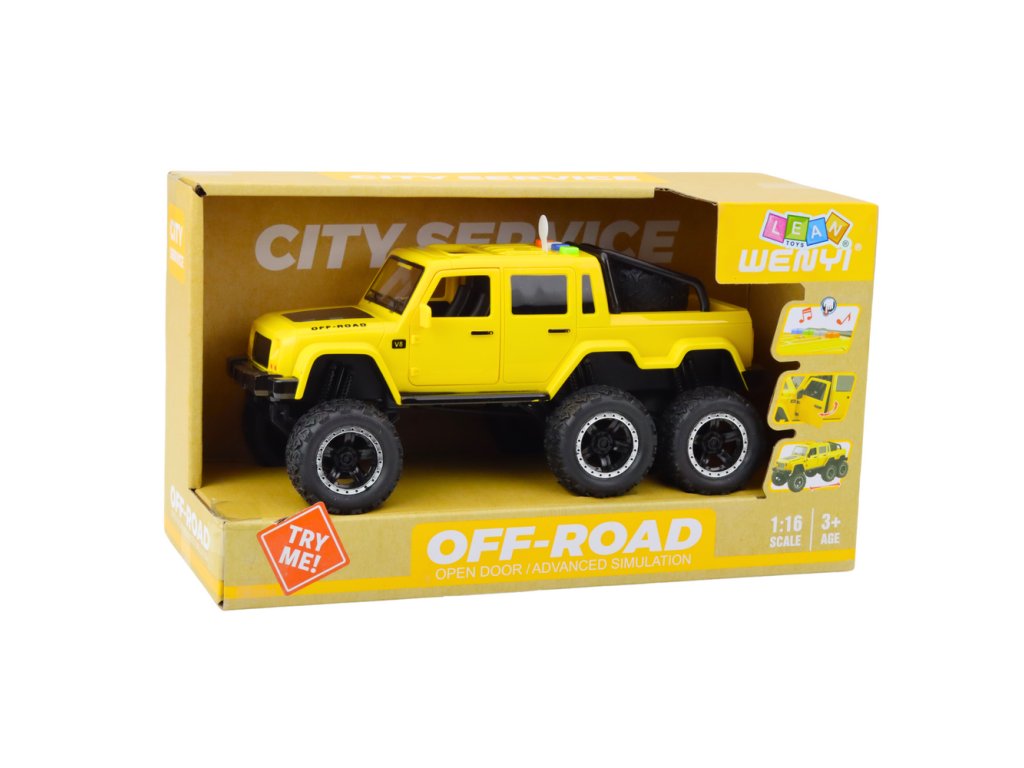Terénní auto setrvačný pohon světla zvuky žluté 6x6 1:16