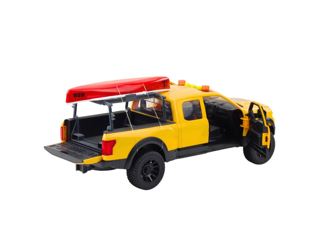 Terénní auto s kajakem je hračka vytvořená pro děti, které milují dobrodružství, výpravy a vozidla s charakterem. Tento model se vyznačuje solidním zpracováním, velkolepými barvami a realistickými detaily. Autíčko má funkční dveře, které se dají otevřít, což usnadňuje hru a rozvíjí jemnou motoriku. Na střeše vozidla je odnímatelný kajak, který může dítě samostatně naložit nebo vyložit a převzít tak roli průvodce expedice na kajaku.