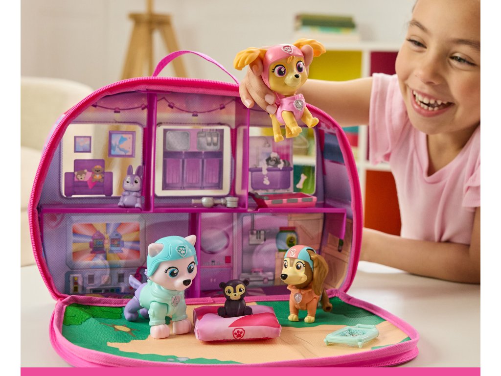 Sada Tlapková patrola: Záchrana štěňat Skye na světě je rozsáhlá kreativní hrací sada, která přenese děti do světa plného záchranných misí a dobrodružství s jejich oblíbenými postavami. Sada obsahuje figurky Skye, Liberty a Everestu s skákacími hlavami a pohyblivými tlapkami , takže si malí snadno zahrají scénky inspirované pohádkou. Doprovázejí je dvě rozkošná zvířátka: plyšový medvídek a králíček , kteří dokonale doplňují tematickou hru.