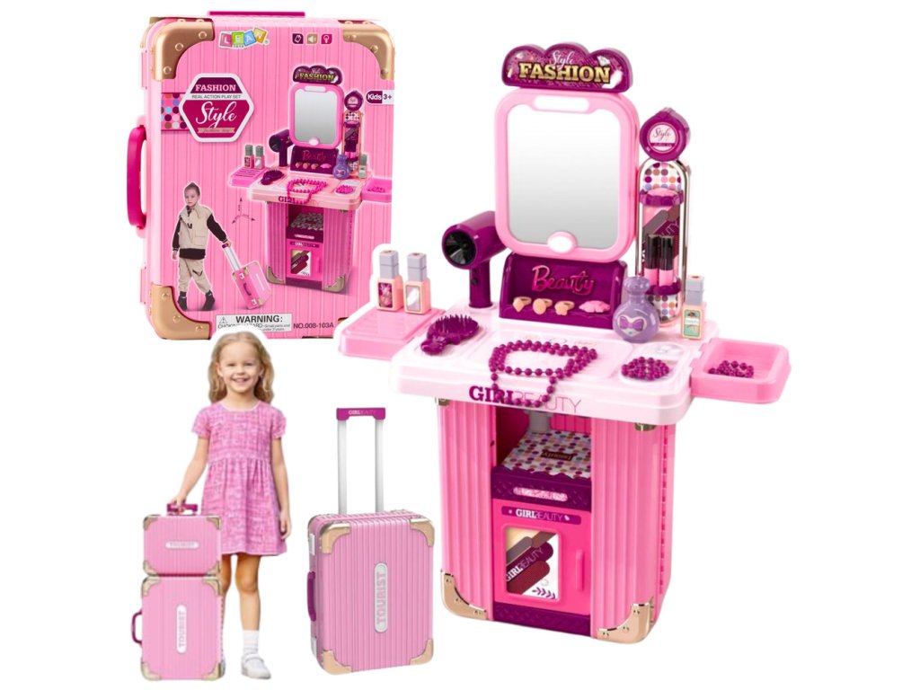 Tato unikátní sada na líčení 2 v 1 v kufru je perfektní hračkou pro každou holčičku, která si ráda hraje na kosmetický salon a vytváří si vlastní vzhled. Sada v sobě spojuje eleganci, funkčnost a praktičnost – po rozložení se kufr promění v okouzlující toaletní stolek se zrcadlem, policemi a bohatou sadou doplňků, jako je fén, štětec, hřeben, kosmetické lahvičky, prsteny, korálky a náramky.