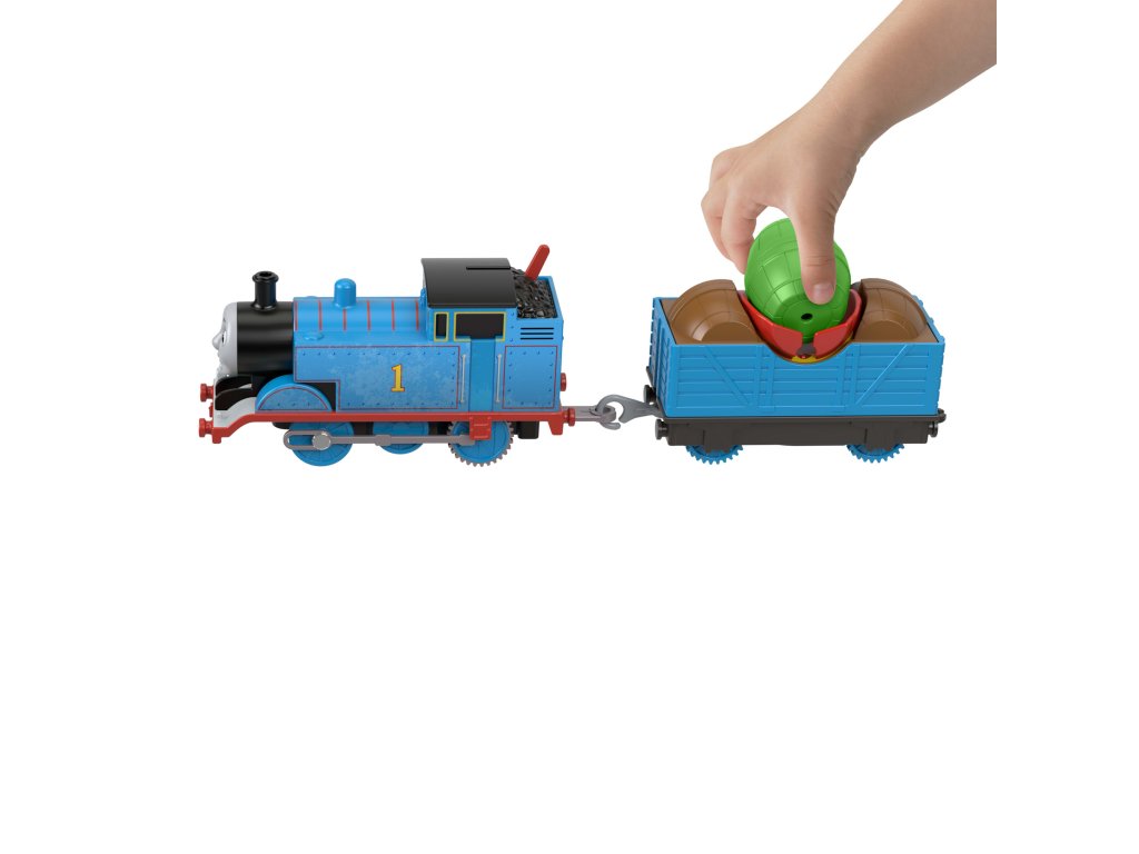 Lokomotiva se po kolejích pohybuje samostatně - stačí přehodit spínač nahoře. Ve skladišti mohou děti naložit jeden ze sudů do vagónu, a když Thomas dorazí na nádraží, náklad automaticky vyskočí na střechu budovy a zazvoní na zvonek, čímž oznámí novou dodávku.